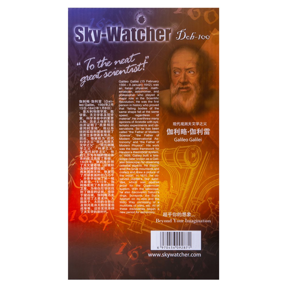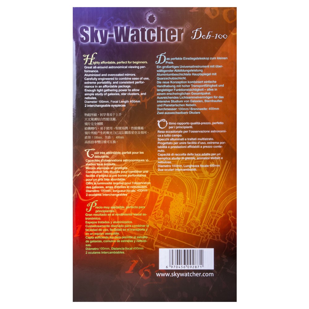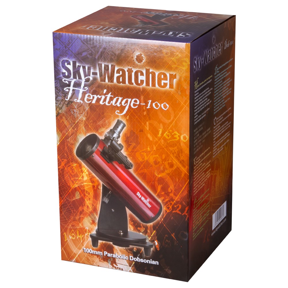 Sky-Watcher Dob 100/400 Heritage – небольшой и легкий телескоп на настольной монтировке, который станет отличным подарком начинающему астроному или увлеченному наукой ребенку. Телескопом легко управлять, а наблюдения можно вести даже не покидая квартиры. Благодаря компактной конструкции телескоп можно поставить на подоконник или стол и изучать космос прямо из своей комнаты. Sky-Watcher Dob 100/400 Heritage – это рефлектор Ньютона, который лучше всего показывает объекты дальнего космоса. Для их изучения в комплект поставки включены два окуляра и линза Барлоу. Благодаря им можно легко подобрать оптимальное для наблюдений увеличение – дополнительные аксессуары не понадобятся. Оптика телескопа также весьма эффективна при изучении Луны. Параболическое главное зеркало очищает передаваемую картинку от сферических искажений и позволяет видеть космос детально и четко. Телескоп установлен на деревянную монтировку Добсона с ручным управлением. Наведение на объекты несложное, ход монтировки плавный и надежный.