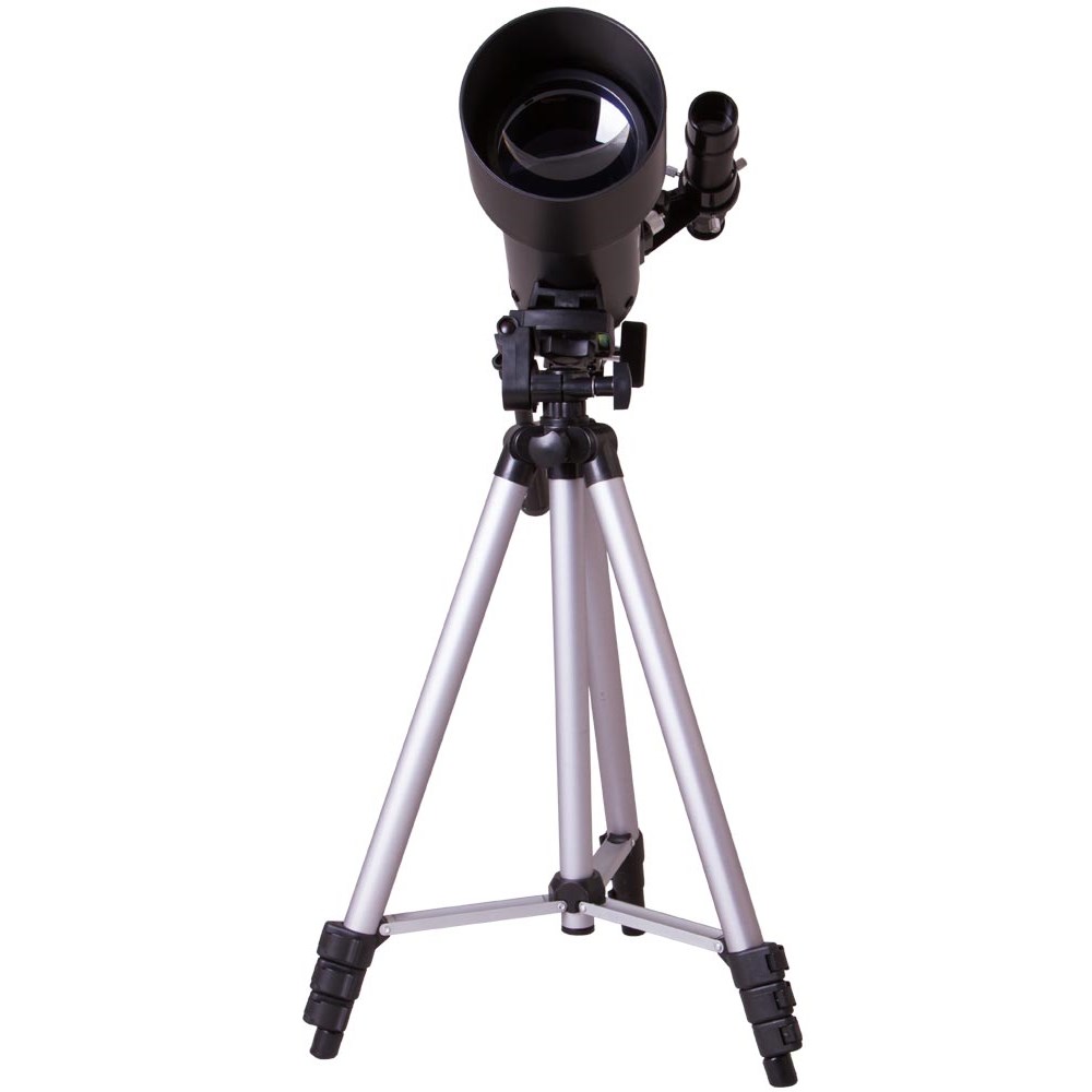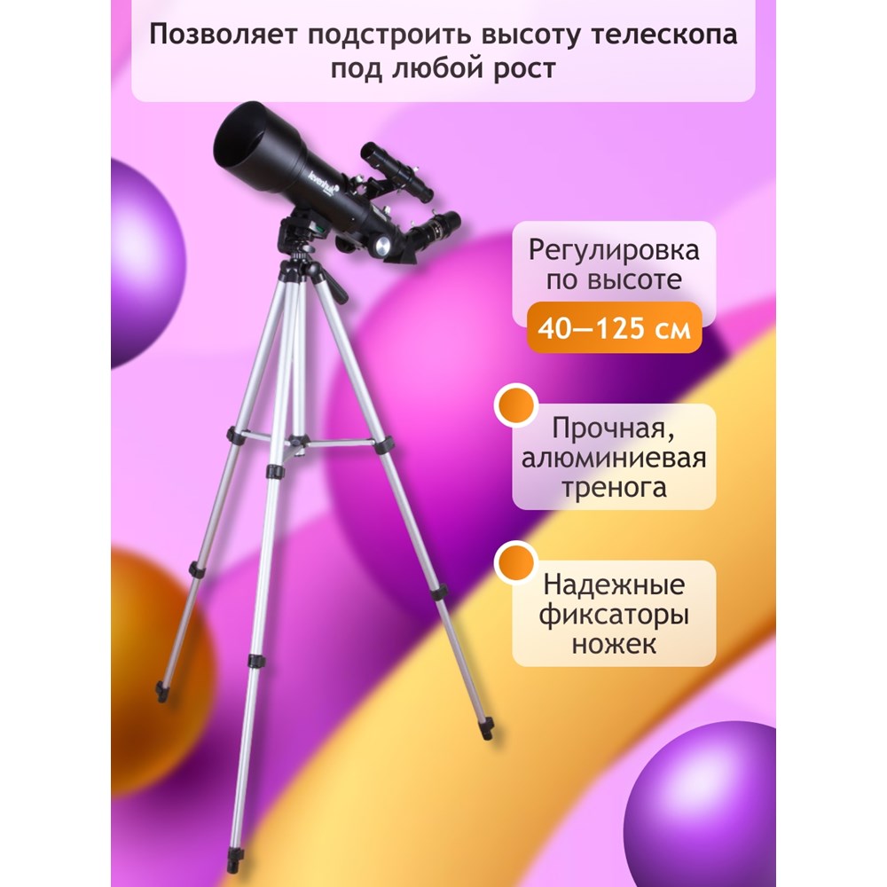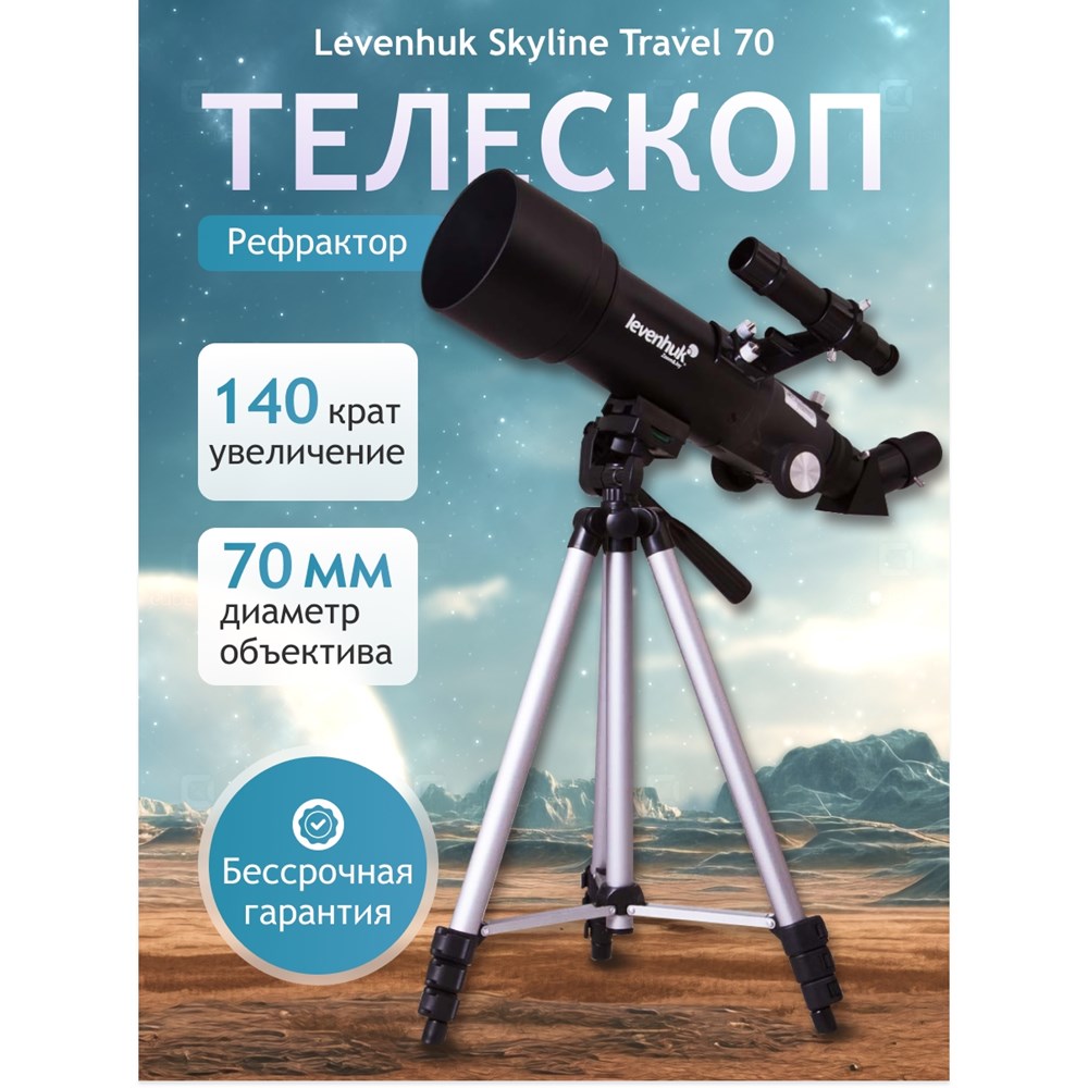 Телескоп Levenhuk Skyline Travel 70 – рефрактор на азимутальной монтировке, который отлично подойдет для астрономических и наземных наблюдений. В него вы изучите лунные кратеры и полярные шапки на Марсе, рассмотрите кольца Сатурна и диск Венеры, понаблюдаете за яркими звездами и туманностями. При необходимости вы сможете использовать телескоп в качестве зрительной трубы – он покажет вам все детали удаленных объектов. В комплект включены все необходимые аксессуары: окуляры, оптический искатель, линза Барлоу и диагональная призма. Увеличение «из коробки» составляет 120 крат. Есть и удобный рюкзак, с помощью которого вы легко довезете телескоп до любой точки наблюдений. Телескопом легко управлять при помощи азимутальной монтировки. Ее можно перемещать или по высоте, или по азимуту. Направить оптическую трубу на объект сможет даже ребенок. Она почти в два раза короче, чем у большинства других рефракторов. А вес конструкции максимально снижен, при этом сохранены все оптические возможности. Для наблюдений используется классическая алюминиевая тренога. Высоту ее ножек можно регулировать, адаптируя телескоп под рост пользователя.