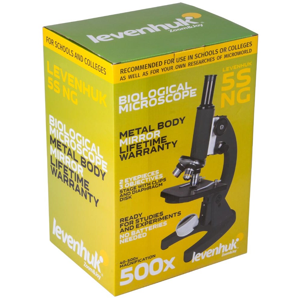 Микроскоп Levenhuk 5S NG – прекрасный выбор для учебы и хобби. Благодаря простому управлению и надежной конструкции этот микроскоп станет хорошим помощником ребенку на многие годы. С помощью Levenhuk 5S NG можно проводить простые биологические опыты, изучать жизнь амеб и инфузорий, рассматривать готовые микропрепараты. Увеличение микроскопа достигает 500 крат, которого вполне хватает для большинства микробиологических исследований начального уровня. В микроскопе используются стеклянные оптические элементы, которые передают четкую и детализированную картинку. Револьверное устройство рассчитано на три объектива, а в окулярную трубку можно устанавливать окуляры разной кратности. Увеличением микроскопа легко управлять прямо во время наблюдений. Механизмы грубой и точной фокусировки позволяют регулировать резкость максимально плавно. Образцы на предметном столике фиксируются при помощи металлических препаратодержателей. В микроскопе Levenhuk 5S NG в качестве осветителя выступает обычное зеркало. Интенсивность освещения меняется при вращении диафрагмы с отверстиями разного размера. Такая конструкция осветительной системы обеспечивает максимальную безопасность при работе с микроскопом, так как не требует подключения к сети. Корпус микроскопа сделан из металла. Он прочен, надежен и долговечен.