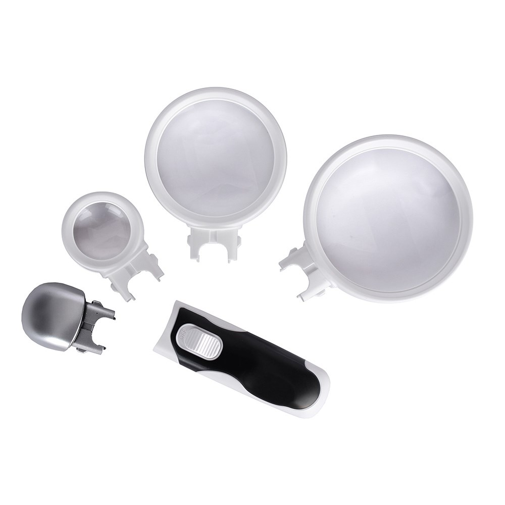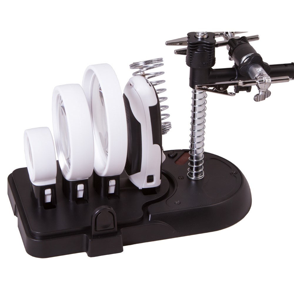 - Основание лупы с гибким штативом, слотом с наждачной бумагой, креплением для линз и отделением для хранения