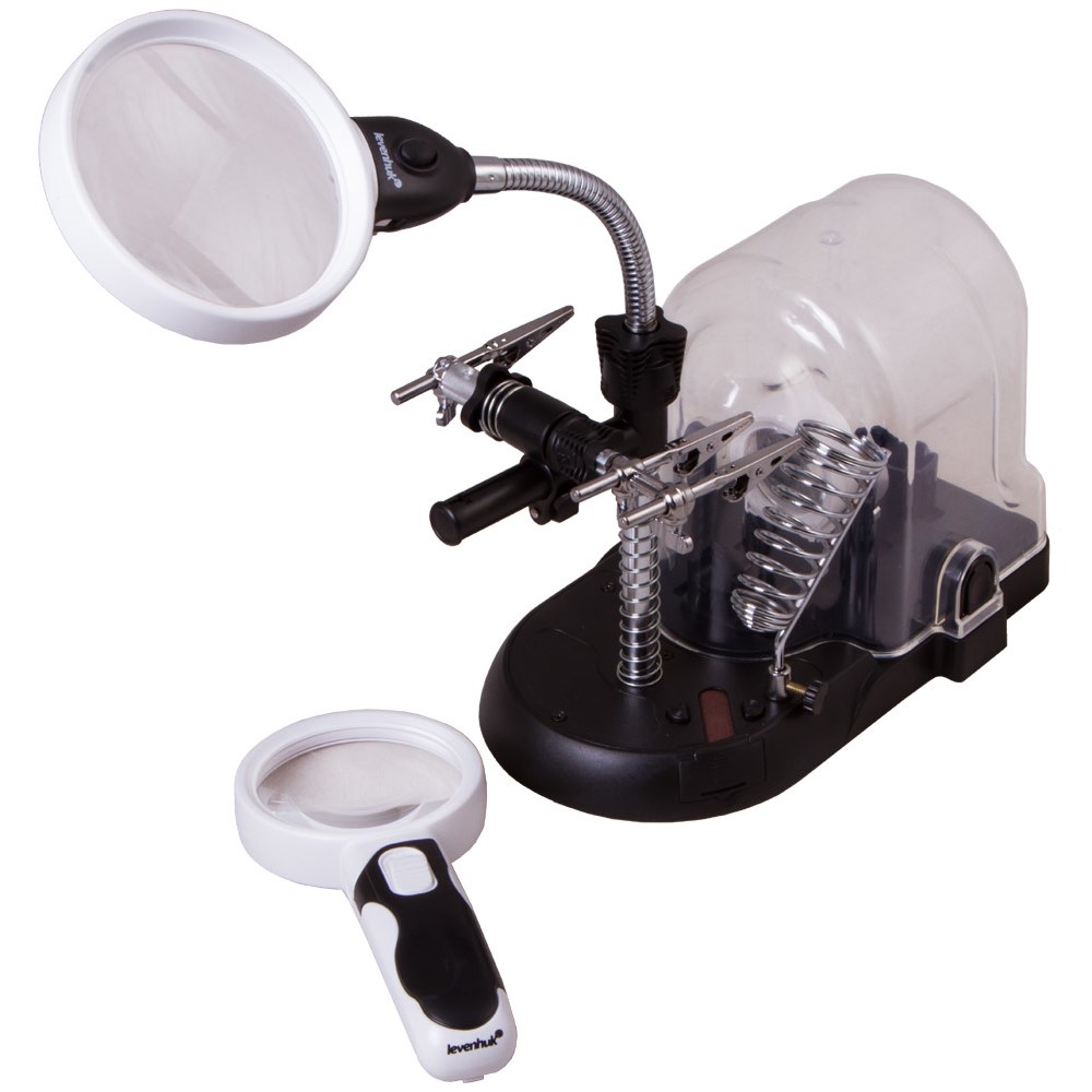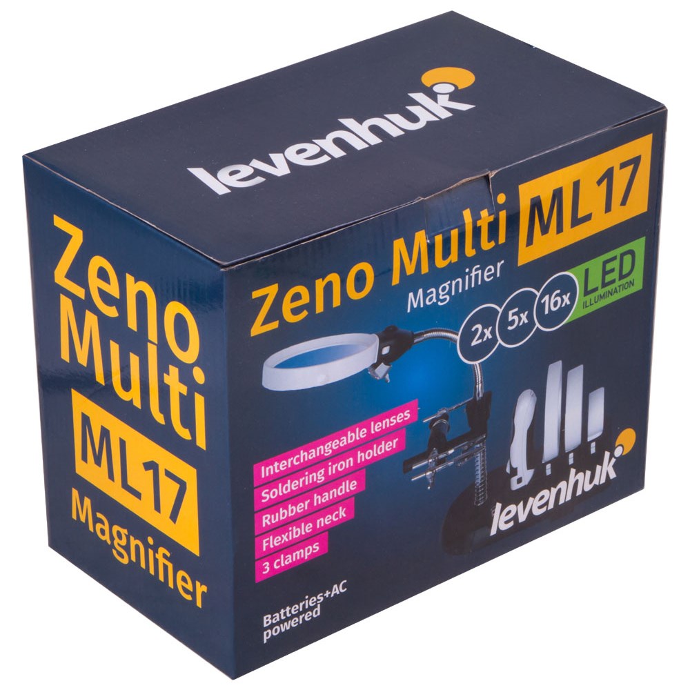 Levenhuk Zeno Multi ML17 – мультилупа, собравшая в себе несколько удобных инструментов для работы. Меняя аксессуары, можно получить три лупы на ручке, три лупы на штативе, настольную лампу и штатив с удобными держателями для плат и паяльника. Levenhuk Zeno Multi ML17 – это функциональность, удобство и надежность. Она пригодится при ремонте микроэлектроники, пайке, создании масштабных моделей и скульптур, оценке ювелирных изделий, часовых работах. Сменные линзы – в комплекте их три – можно устанавливать или на гибкий штатив, или на небольшую эргономичную ручку. В зависимости от выбора получатся настольные или просмотровые лупы. Заменив линзу на штативе на плафон для подсветки, можно получить удобную настольную лампу. В мультилупе есть подсветка. На штативе расположено шесть светодиодов, в ручке – два. Они работают от батареек (нет в комплекте) и сетевого адаптера (есть в комплекте, питает только подсветку на штативе). Хранить все съемные аксессуары можно в специальном боксе в основании лупы. Внимание! Помните, что напряжение сети в России и большинстве европейских стран составляет 220–240 В. Если вы хотите использовать устройство в стране с другим стандартом сетевого напряжения, необходимо включать его в розетку только через соответствующий конвертер (преобразователь напряжения).