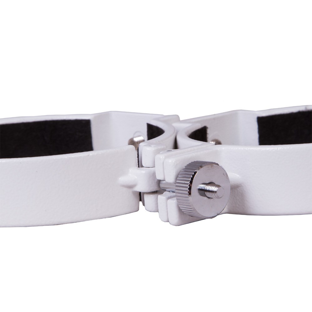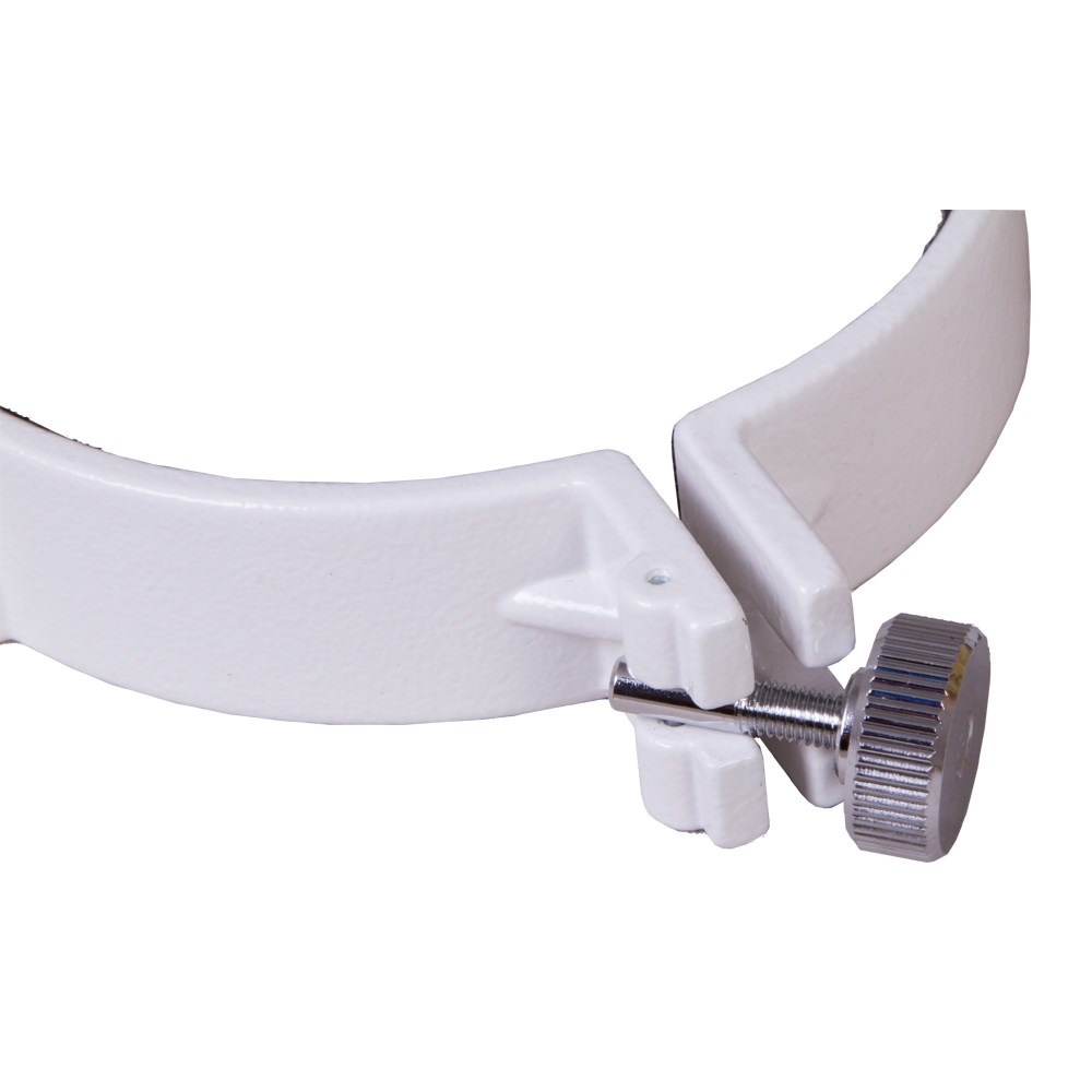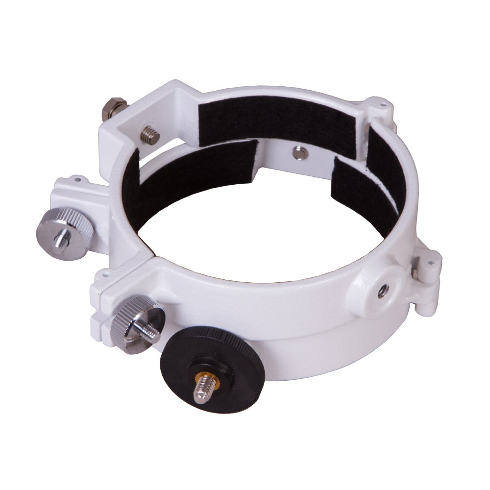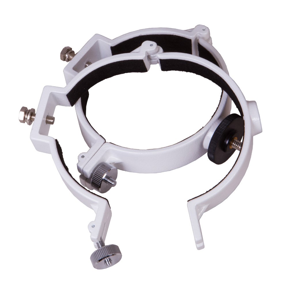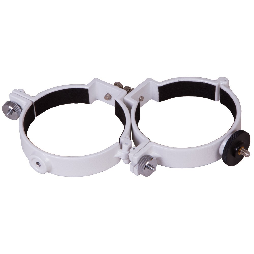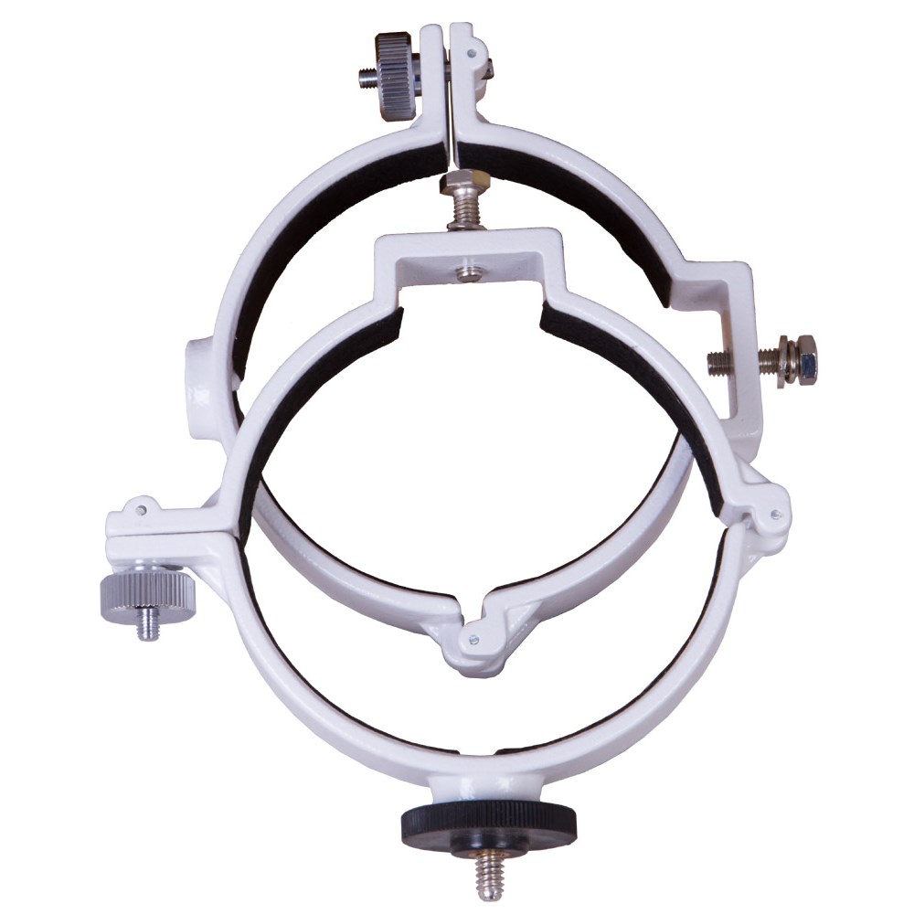 Крепежные кольца Sky-Watcher – аксессуар для телескопов, который позволяет фиксировать на монтировке оптическую трубу рефрактора с диаметром объектива 101–102 мм. В комплект поставки включены два кольца, на одном из которых есть отдельное крепление для фотооборудования. Кольца совместимы с любыми монтировками с винтовым креплением 1/4” или с креплением «ласточкин хвост». Степень фиксации трубы в кольцах можно регулировать при помощи боковых винтов.