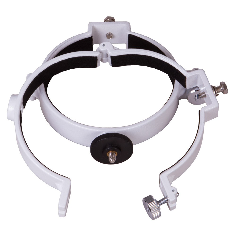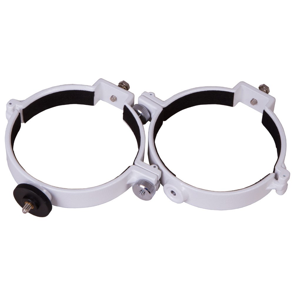 Крепежные кольца Sky-Watcher – это набор из двух металлических колец, которые предназначены для фиксирования оптической трубы на монтировке. Силу крепления каждого кольца можно регулировать отдельно. На одном из колец есть крепление для фотооборудования. Эти крепежные кольца Sky-Watcher совместимы с рефракторами с апертурой 114–116 мм и снабжены стандартным посадочным креплением 1/4” и креплением «ласточкин хвост».