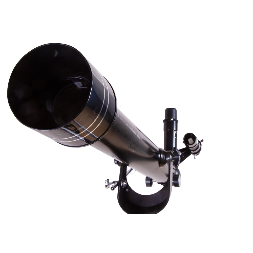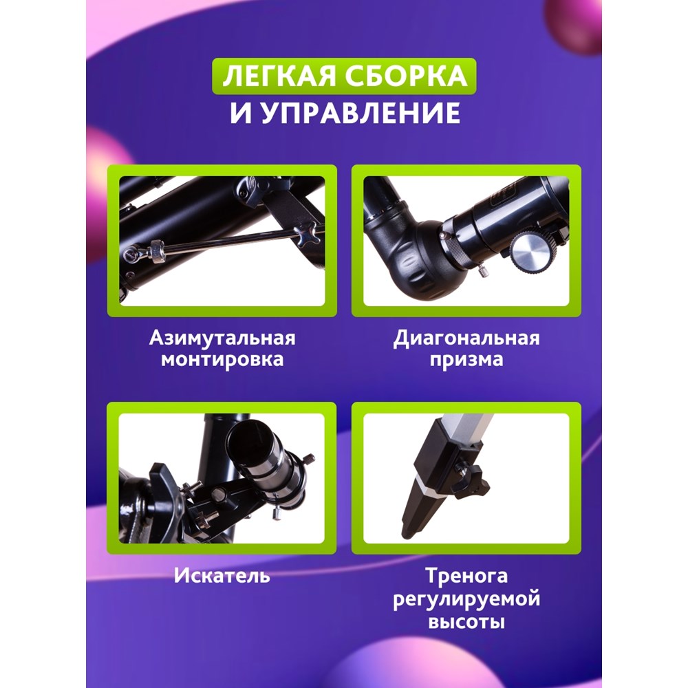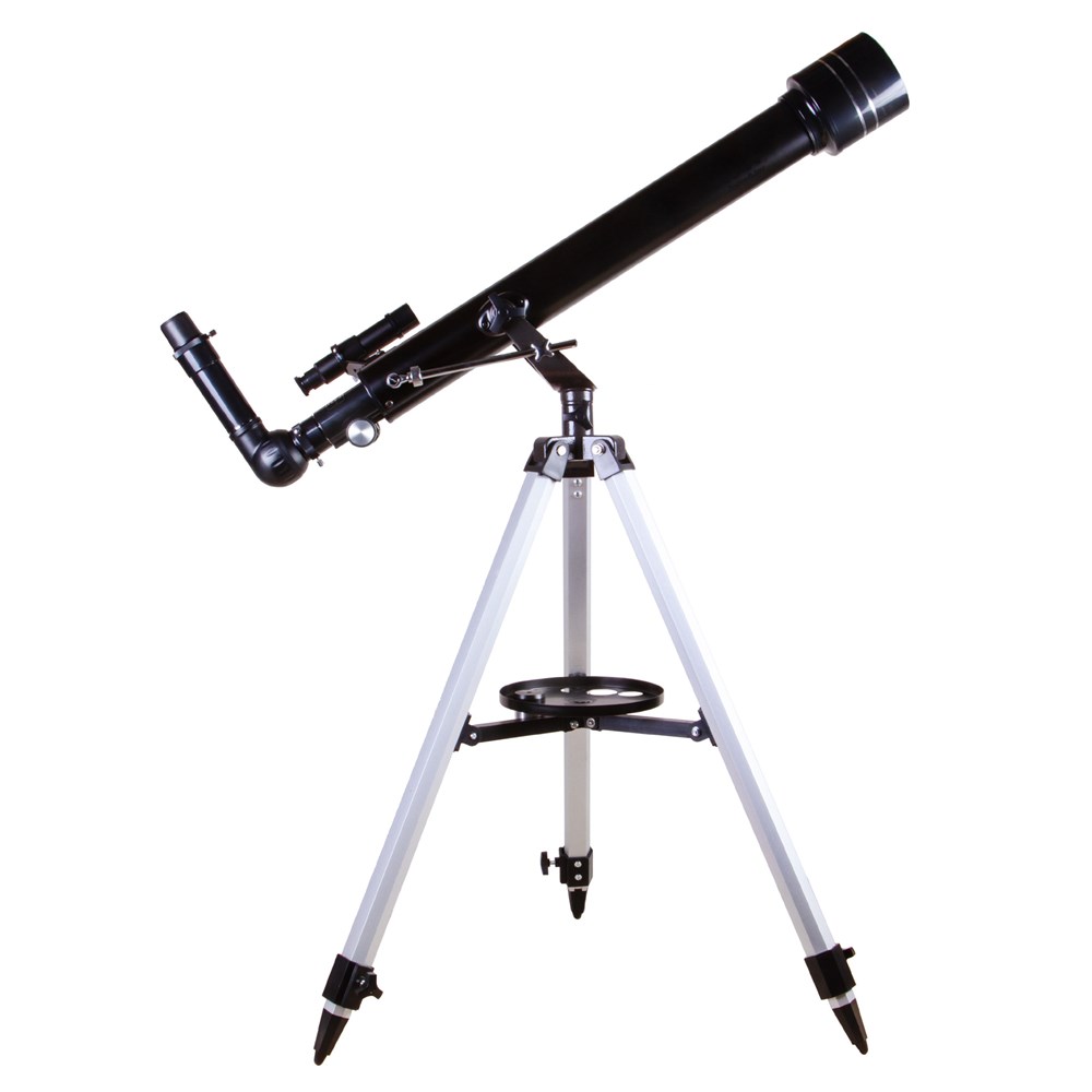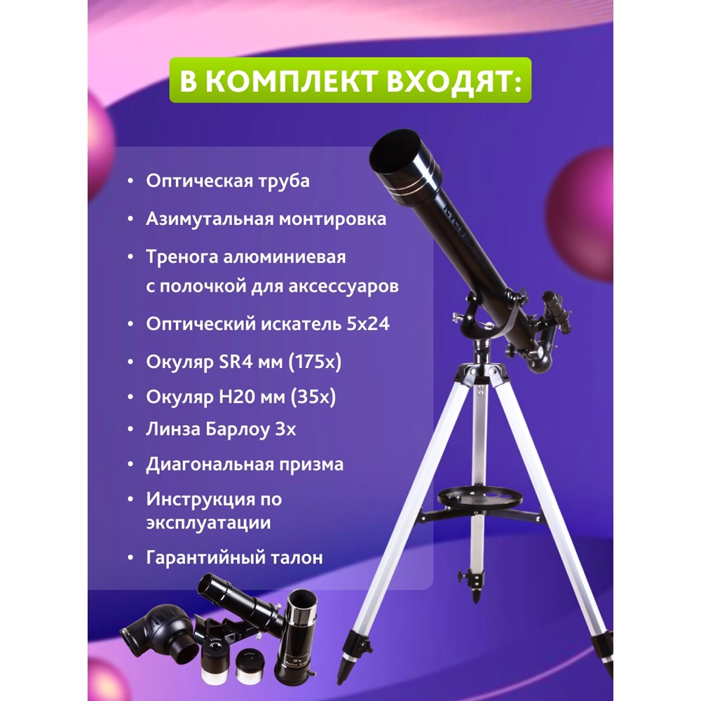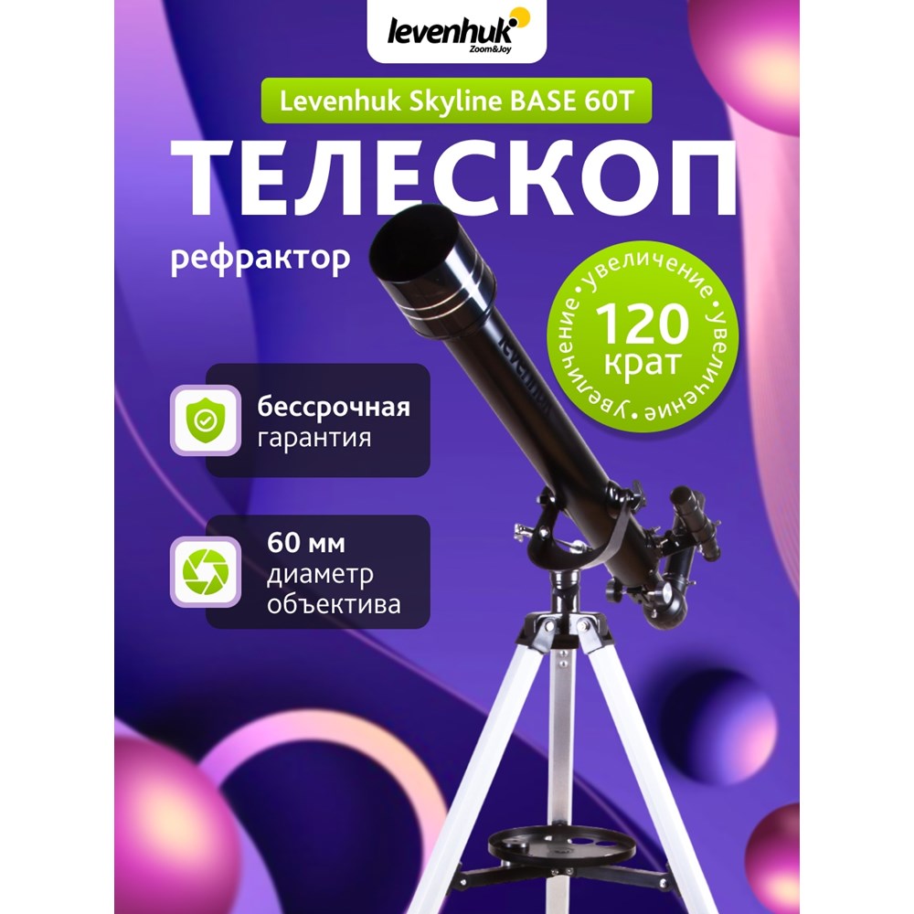 Levenhuk Skyline BASE 60T – рефрактор для начинающих астрономов, отличающийся простым управлением и хорошей оптикой. В него можно увидеть кратеры на Луне, фазы Венеры, яркие галактики и двойные звезды. Телескоп отлично подходит для наземных наблюдений и изучения планет Солнечной системы, объекты дальнего космоса он показывает без деталей. В комплект поставки включены основные оптические аксессуары, поэтому Levenhuk Skyline BASE 60T – отличный выбор для подарка. Все, что нужно для наблюдений, любитель астрономии найдет в коробке с телескопом. Благодаря полностью просветленной оптике из стекла телескоп передает картинку прекрасного качества. Вплоть до максимально полезного увеличения четкость и ясность изображения остаются на высоком уровне – можно наблюдать тусклые звезды и детально рассматривать поверхность Луны. Наводить телескоп на объекты на небосклоне помогает оптический искатель с 5-кратным увеличением и азимутальная монтировка начального уровня. Чтобы освоить управление, не нужно никаких знаний и умений – с телескопом способен справиться и начинающий астроном, и ребенок. В комплект поставки включены короткофокусный и длиннофокусный окуляры и диагональная призма. Меняя окуляры, можно добиться разного увеличения. На большой кратности удобно изучать крупные объекты – так можно увидеть больше деталей, а малое увеличение позволяет охватить одним взглядом протяженную область. Диагональная призма незаменима при наземных наблюдениях. Оно исправляет свойственную телескопам перевернутость картинки – возвращает верх и низ изображения на свои места. Телескоп устанавливается на алюминиевую треногу. На ней фиксируется лоток для аксессуаров. Высоту ножек треноги можно регулировать.