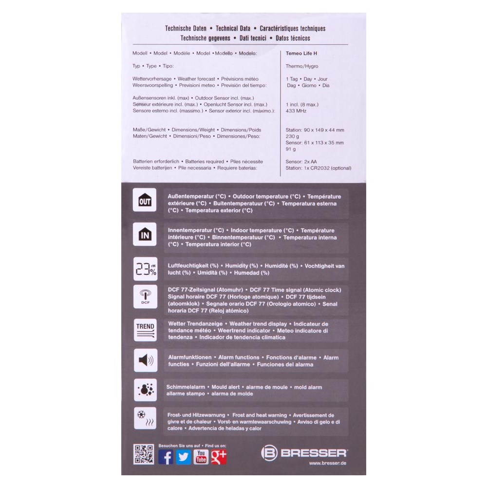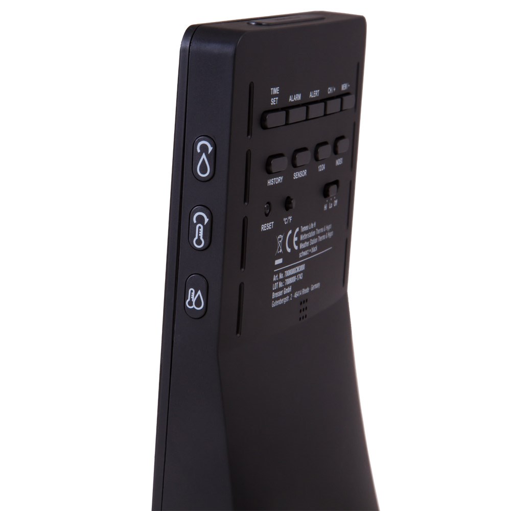 Bresser Temeo Life H – домашняя цифровая метеостанция в стильном корпусе. Все измерения выводятся на встроенный экран, который отображает до 256 цветов и может реагировать сменой оттенка на изменения температуры и влажности воздуха. Bresser Temeo Life H – современный гаджет для дома или дачи. Метеостанция состоит из основного модуля и радиодатчика. Для общения они используют радиоканал, поэтому прокладывать провода по квартире не нужно. Связь стабильна на расстоянии до 30 метров. Датчик проводит измерения на улице, основной модуль – в помещении. Кроме того, в метеостанции есть часы с будильником. Экран метеостанции поделен на блоки. В верхней части отображаются время, дата и иконка прогноза погоды. Последняя принимает одно из нескольких значений: ясно, облачно, переменная облачность, дождь, снег. Прогноз составляется исходя из проводимых измерений. Центральная часть экрана отведена под влажность воздуха, нижняя – под температуру. Индикация четкая и хорошо различимая с большого расстояния. Кнопки управления вынесены на заднюю крышку и боковые панели метеостанции.
