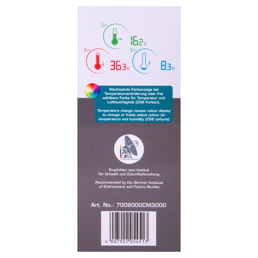 • Стильная домашняя метеостанция с цветным экраном • Цвет индикации меняется в зависимости от показаний (256 оттенков) • Крупные иконки и четкие символы, хорошо различимые с большого расстояния • Показывает время, дату, температуру, влажность воздуха и прогноз погоды • Будильник с функцией повтора Комплект поставки: • Метеостанция • Наружный датчик • Сетевой адаптер • Инструкция по эксплуатации и гарантийный талонТехнические характеристики