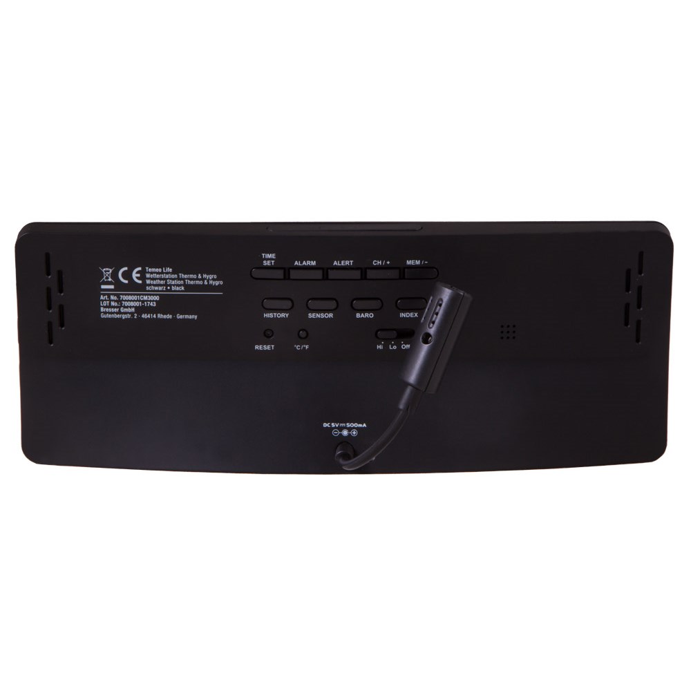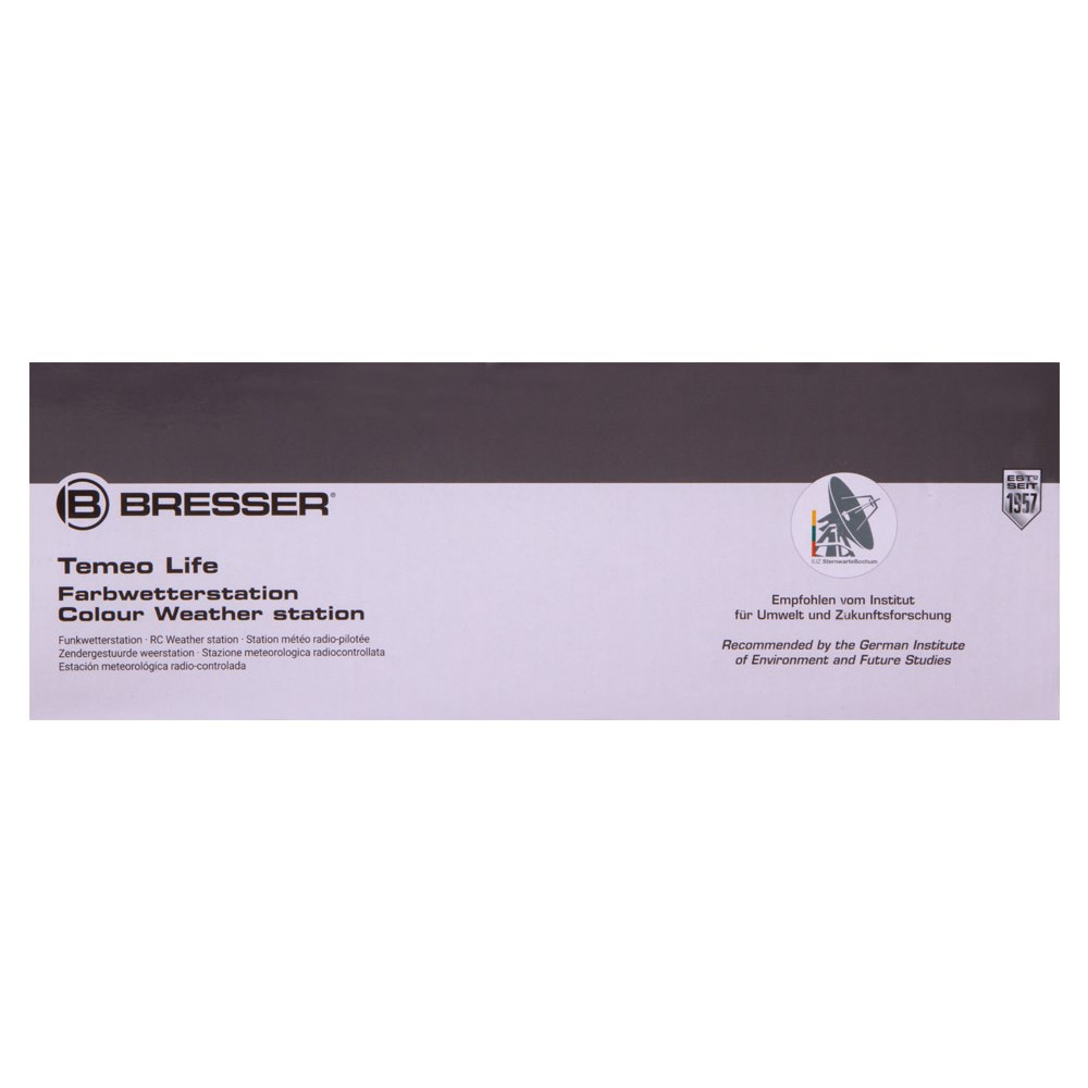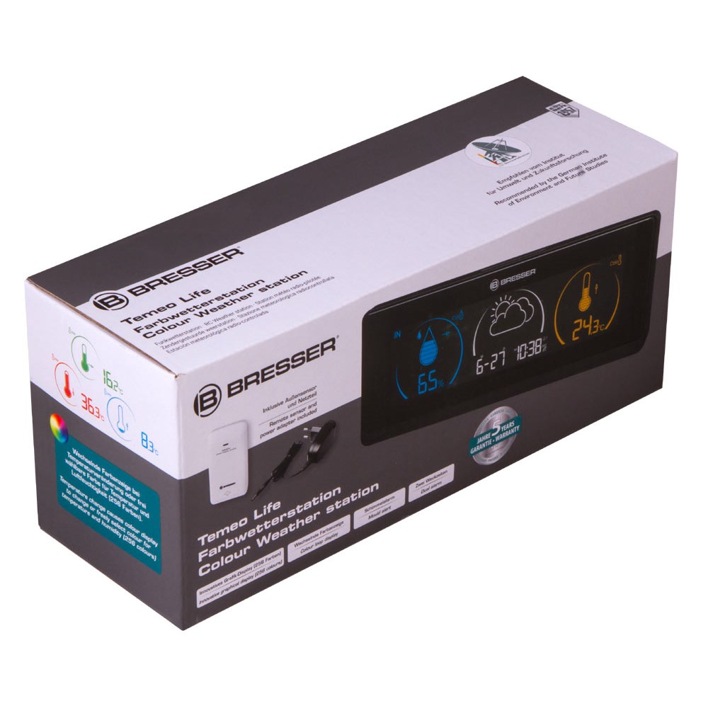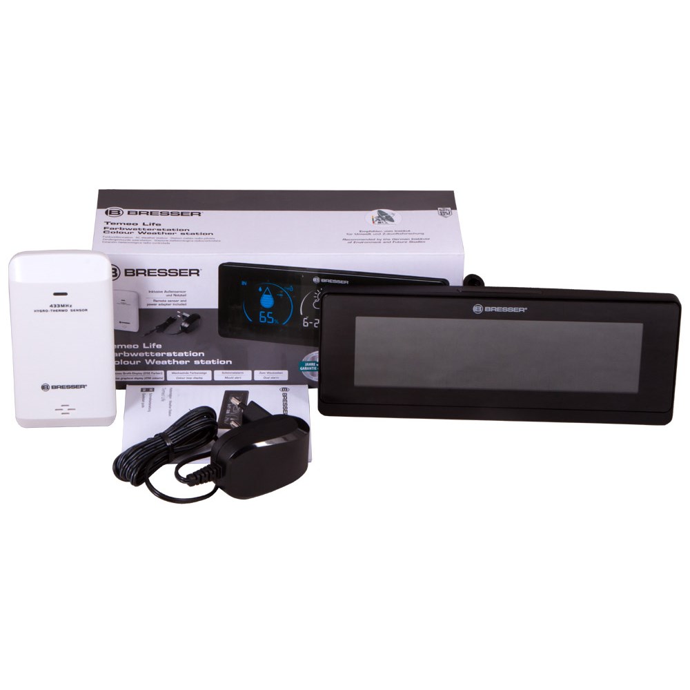 Bresser Temeo Life – метеостанция с наружным датчиком, которая измеряет температуру и влажность воздуха на улице и в помещении. В ней также есть встроенные часы, будильник и календарь. Метеостанция станет отличным подарком себе или близкому человеку и поможет следить за изменениями погоды. Наружный датчик и основной модуль «общаются» через радиоканал, проводное подключение не требуется. Связь стабильна на расстоянии до 30 метров. Датчик собирает данные снаружи, модуль – внутри помещения. Измерения выводятся на встроенный экран метеостанции в понятной форме. В левой части экрана показывается значение влажности. В центральном блоке находятся иконка прогноза погоды, дата и текущее время. Правая часть экрана отведена под температуру воздуха. Метеостанцию можно установить на любую горизонтальную поверхность, для питания основного модуля требуются батарейки (приобретаются отдельно) или сетевой адаптер (в комплекте). Наружный датчик работает от батареек (нет в комплекте).