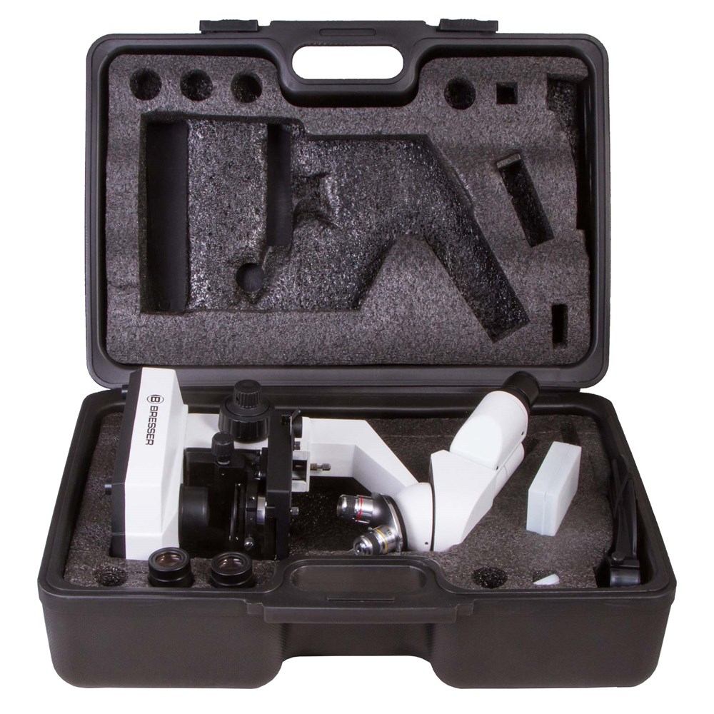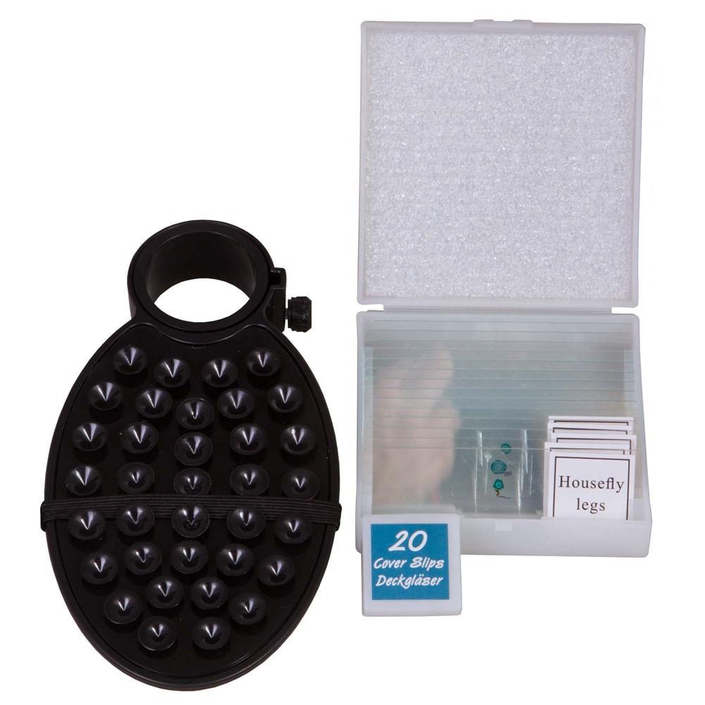 Микроскоп Bresser Erudit Basic 40–400x с ахроматической оптикой позволит изучать микрообразцы максимально подробно и без искажений. С его помощью можно рассматривать любые прозрачные образцы – срезы тканей растений и животных, готовые микропрепараты. Микроскоп пригодится для выполнения школьных лабораторных работ и поможет начинающему исследователю микромира сделать первые шаги в науке. В комплект поставки включен набор для проведения опытов. Оптическая схема микроскопа состоит из бинокулярной насадки и револьверного устройства с тремя объективами. Насадку можно вращать на 360°. Общее увеличение микроскопа составляет от 40 до 400 крат – этого вполне достаточно для любительского уровня микронаблюдений. Образцы фиксируются на предметном столике. Он снабжен препаратоводителем и измерительными шкалами. Предметный столик можно перемещать в двух направлениях. Система освещения расположена снизу. Она состоит из светодиода и конденсора Аббе с диафрагмой. Для питания подсветки используются стандартные батарейки. Еще одна особенность микроскопа – адаптер для смартфона, входящий в комплект поставки. С его помощью на окулярной трубке можно фиксировать мобильное устройство и использовать его камеру для фотографирования своих наблюдений.