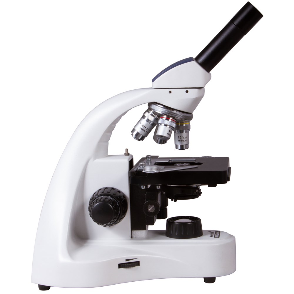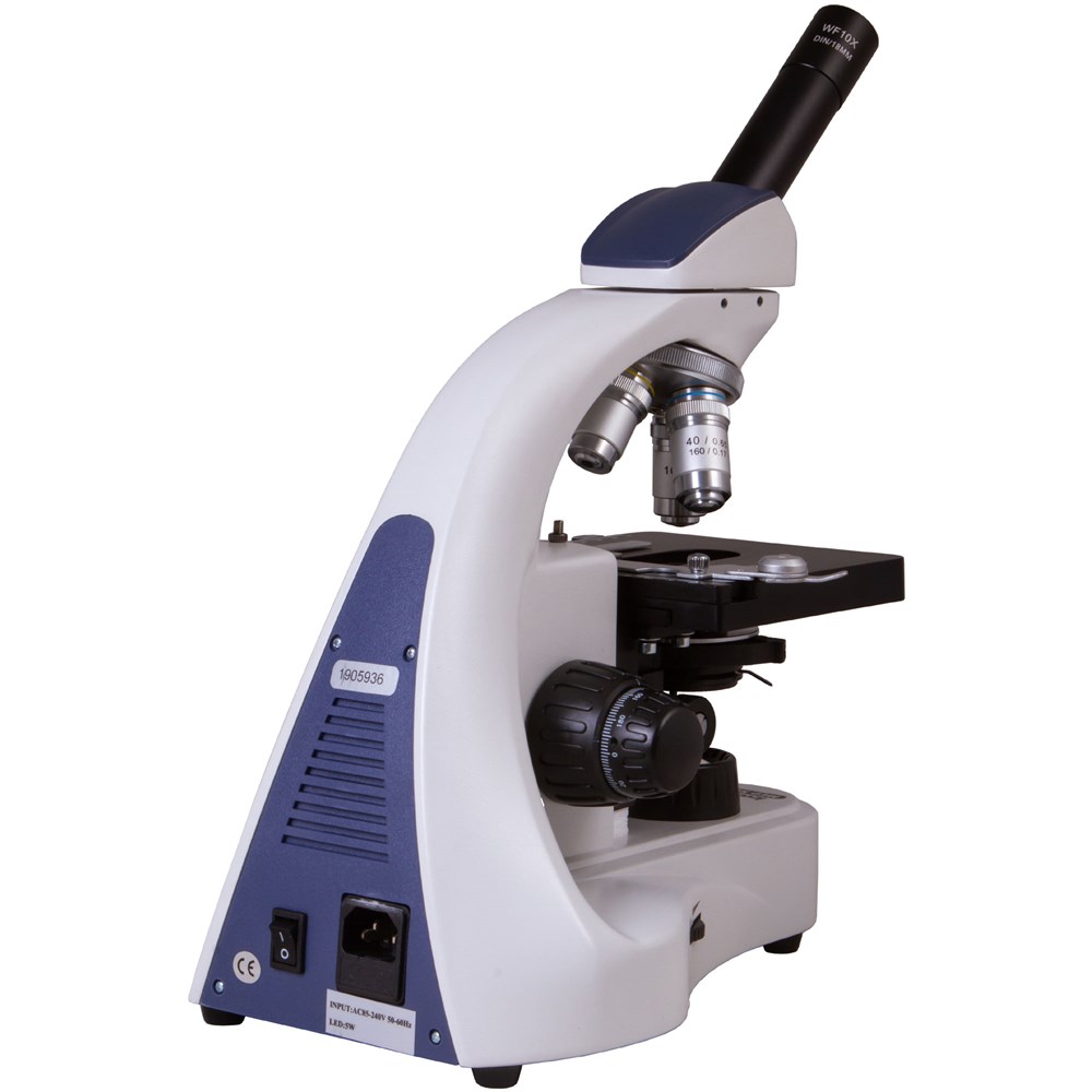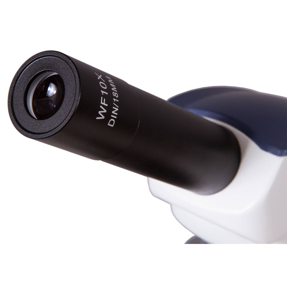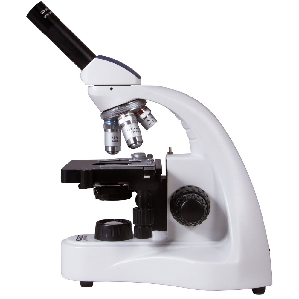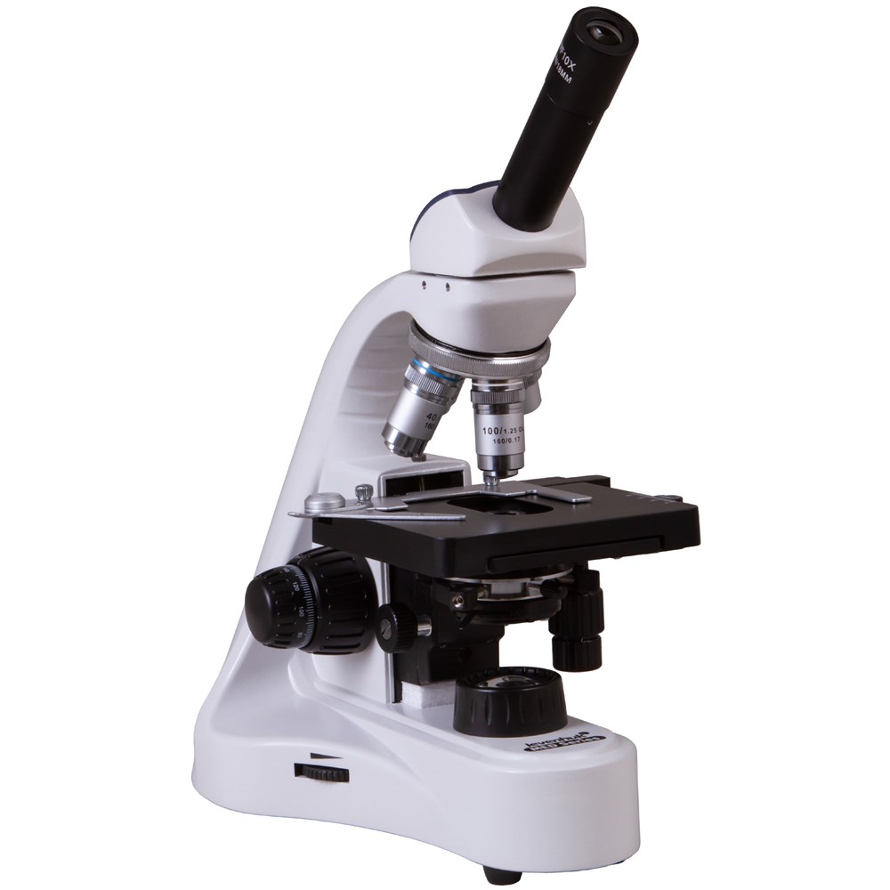 Levenhuk MED 10M – монокулярный микроскоп для профессиональной работы с микрообразцами. Он дает увеличение от 40 до 1000 крат, передает картинку высокого качества, позволяет использовать при наблюдениях масляную иммерсию. Микроскоп отлично подходит для обучения студентов медицинских и биологических университетов, профессиональных исследований в лабораториях и научных центрах. В Levenhuk MED 10M используется ахроматическая оптика, которая передает четкое и контрастное изображение. Монокулярная насадка наклонена под углом в 45° и может поворачиваться вокруг своей оси на 360°. Микроскоп удобно использовать при групповых исследованиях, а также для длительного изучения образцов. Оптика сделана из стекла с антигрибковым покрытием. Широкопольный окуляр обеспечивает хороший обзор, а объективы разной кратности позволяют подбирать оптимальное увеличение для наблюдений микропрепаратов. Два объектива имеют защитные пружинящие оправы. 100-кратный объектив можно использовать для наблюдений иммерсионным методом (флакон с маслом включен в комплект поставки). Для настройки оптики под особенности зрения пользователя можно использовать диоптрийную коррекцию. Под револьверным устройством находится механический столик с препаратоводителем. Столик можно перемещать по двум направлениям. Яркая светодиодная подсветка находится в нижней части микроскопа. В систему освещения также входит конденсор Аббе с ирисовой диафрагмой. Есть держатель фильтра. Доступны точная и грубая фокусировки. Для питания подсветки требуется подключение к сети переменного тока. Яркость подсветки регулируется.