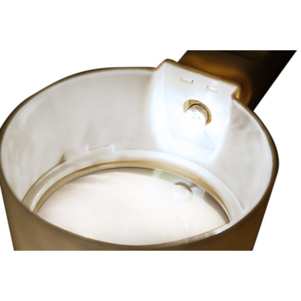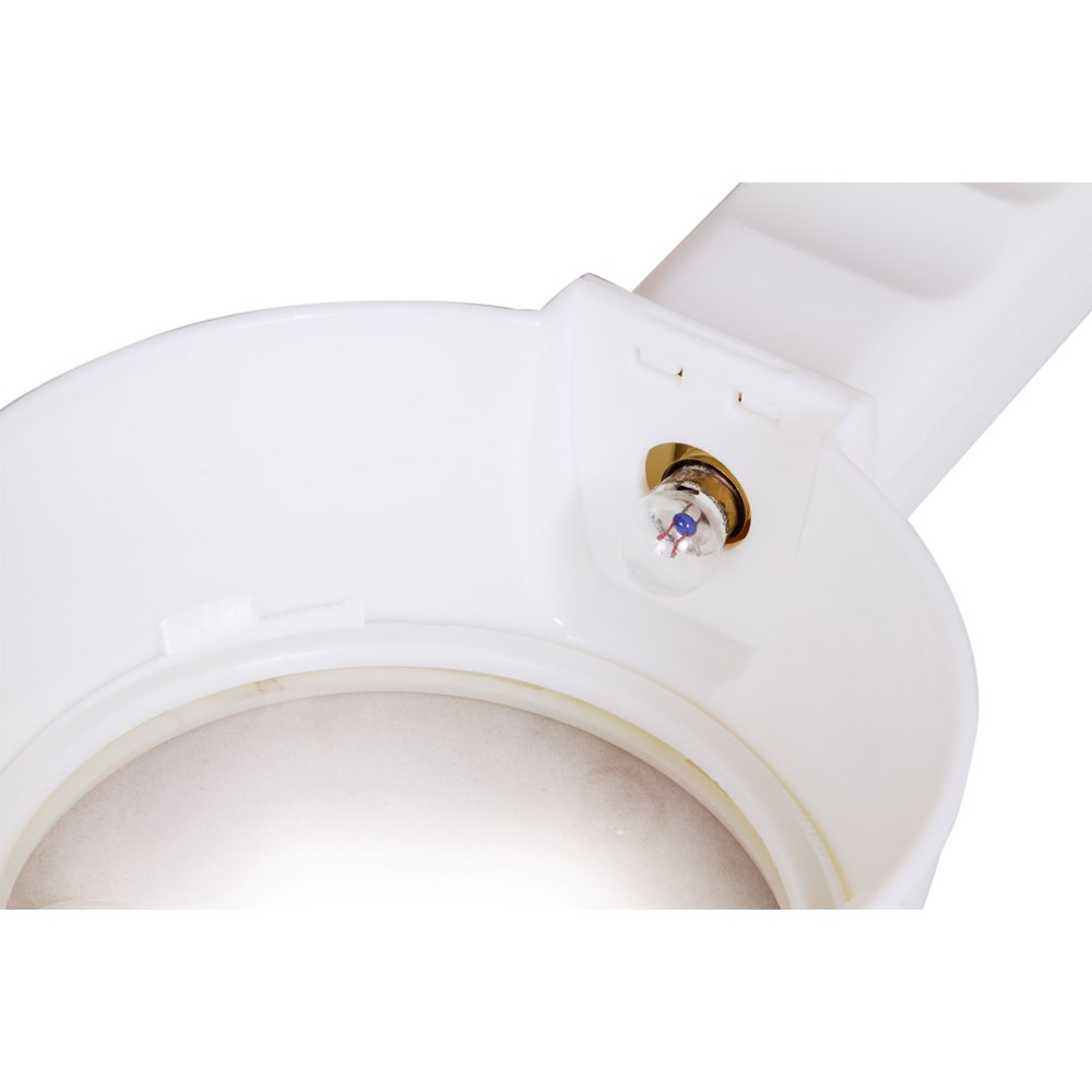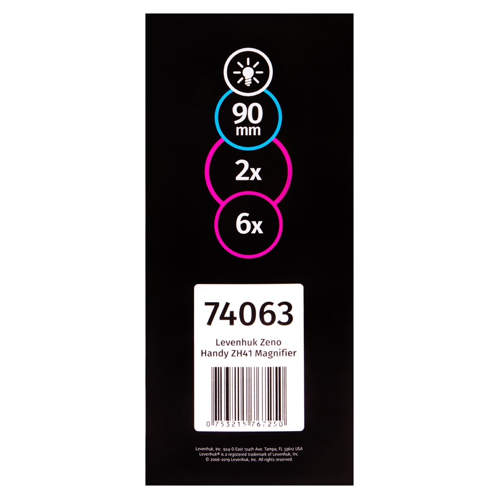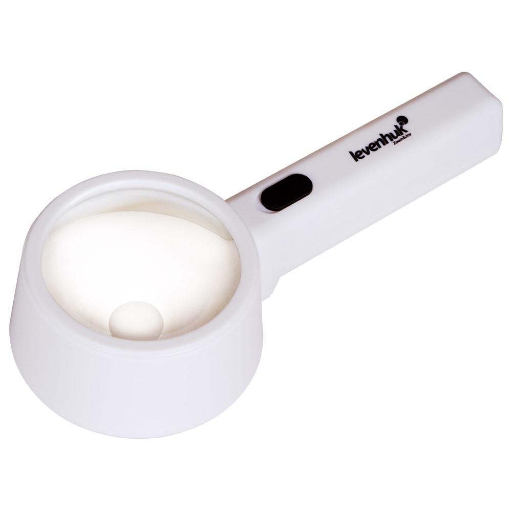 Levenhuk Zeno Handy ZH41 – ручная лупа с подсветкой, которая пригодится в работе с мелкими объектами. С ее помощью можно прочитать текст, набранный небольшим шрифтом, или рассмотреть крохотный дефект на одежде или мебели. Лупа дает два увеличения – 2 и 6 крат. Работать можно или с большой (90 мм), или с маленькой (21 мм) областью. Линза сделана из пластика, оправа и ручка – тоже пластиковые. Переключатель подсветки расположен на ручке. Чтобы использовать подсветку, нужны батарейки (нет в комплекте).