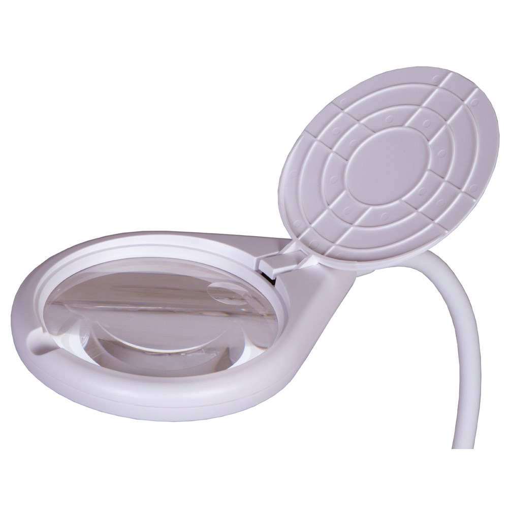 Лупа Levenhuk Zeno Desk D17 – настольная модель лупы со светодиодной подсветкой. Ее можно зафиксировать на столешнице, дверце шкафа или полке и свободно поворачивать на гибком штативе. Фиксация производится с помощью зажима-прищепки. Такой помощник пригодится в ювелирной или часовой мастерской, в сервисном центре, на рабочем месте рукодельницы. Людям с творческим хобби лупа поможет в работе с мелкими деталями – поклейке, сборке, окраске и других манипуляциях. Линз лупы Levenhuk Zeno Desk D17 является бифокальной: на области диаметром 108 мм она дает увеличение в 2,3 крата, на небольшой отдельной области – 6 крат. Чтобы защитить линзу от скопления пыли и механических повреждений, ее можно закрывать откидной крышкой по окончании работ. Блок подсветки включает в себя 8 ярких светодиодов с возможностью регулировки яркости освещения. Для работы подсветки необходимо подключение к сети.