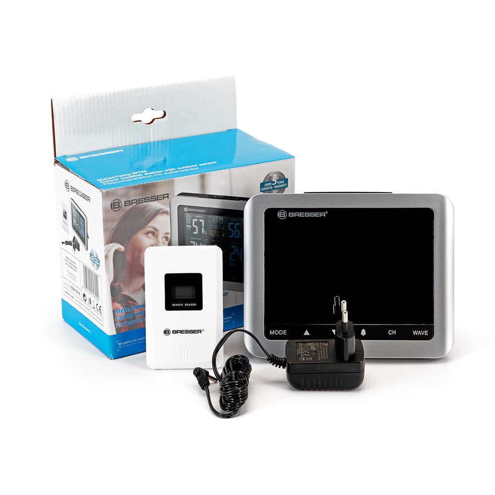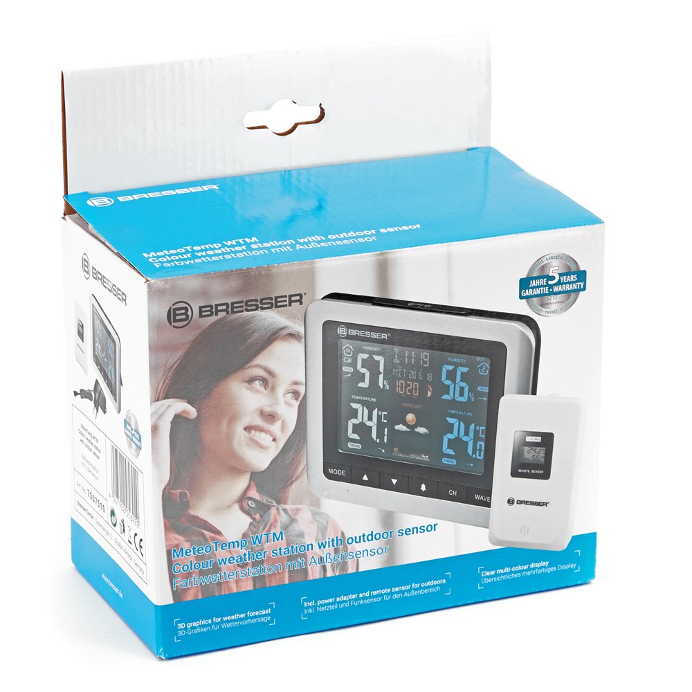 Метеостанция Bresser MeteoTemp WTM с цветным экраном предназначена для того, чтобы владелец мог следить за капризами погоды за окном и точно отслеживать изменения микроклимата дома. Прибор измеряет уровень атмосферного давления, температуру и влажность воздуха, также показывает время и дату, фазу Луны, может разбудить на работу сигналом будильника. Кроме того, на основе полученных данных метеостанция умеет составлять прогноз погоды на ближайшее время. Bresser MeteoTemp WTM – это отличный подарок и хороший выбор для городской квартиры. Помимо основного модуля, который устанавливается внутри помещения, в комплектацию включен термогигродатчик. Его обычно выносят за окно, благо для передачи данных используется радиоканал. Дальность сигнала составляет 30 метров. Для питания датчика используются стандартные батарейки, которые приобретаются отдельно. У датчика есть собственный экран. И датчик, и сам прибор можно вешать на стену или ставить на любую горизонтальную поверхность. Для питания основного модуля требуются подключение к сети или батарейки (не включены в комплект поставки).