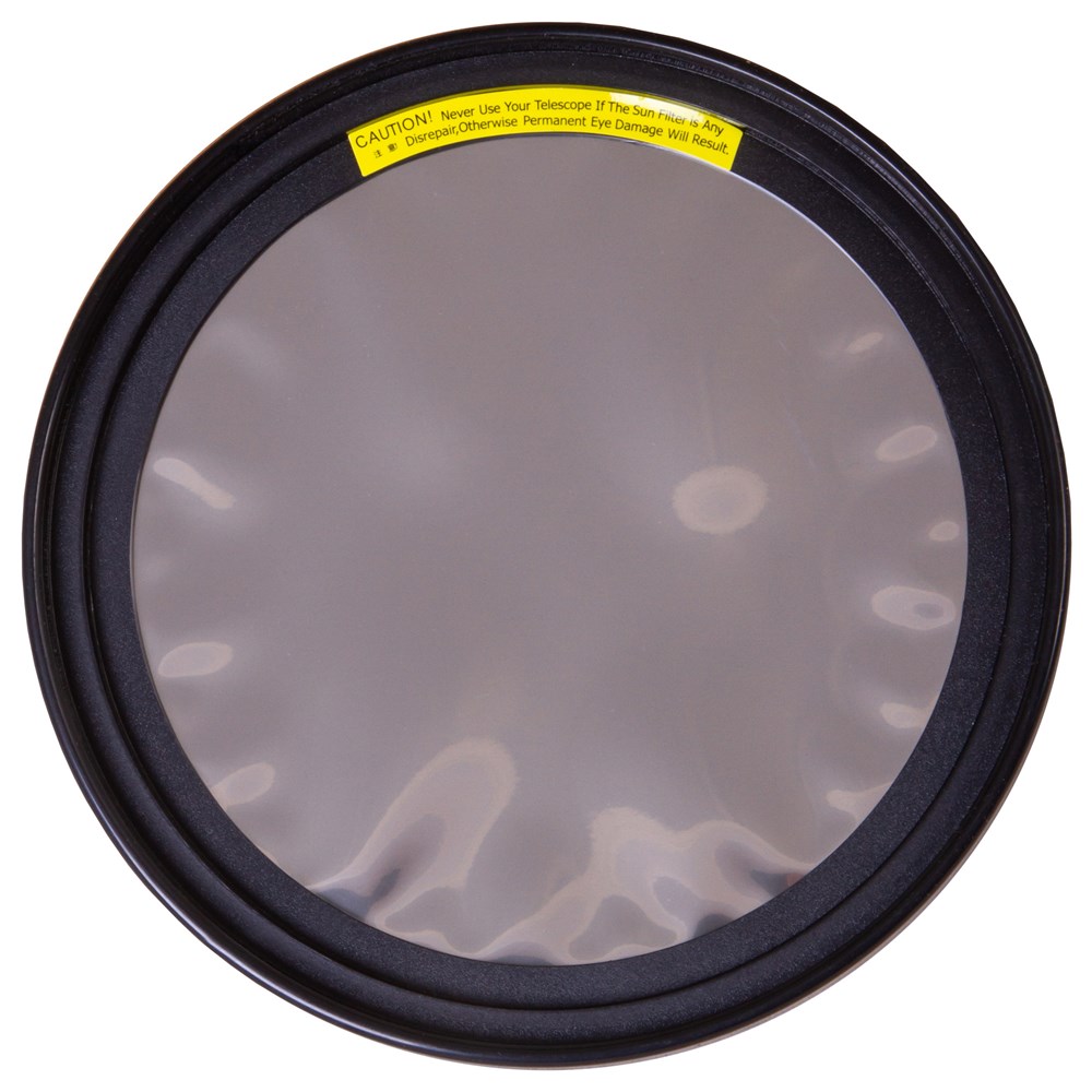 Солнечный фильтр Sky-Watcher предназначен для безопасного наблюдения Солнца. Он создан для совместного использования с рефлекторами с апертурой 150 мм. Фильтр представляет собой специальную защитную пленку в пластиковом корпусе. Он фиксируется на объективе телескопа и позволяет не опасаться за зрение при изучении солнечного диска. Коэффициент светопропускания фильтра – 0,001%. При наблюдениях Солнце имеет нейтрально-белый цвет. С помощью фильтра можно изучать факельные поля, грануляцию, солнечные пятна. Он также позволяет наблюдать транзиты планет по солнечному диску. Внимание! Наблюдения Солнца без специального фильтра могут привести к необратимым повреждениям зрения и слепоте.