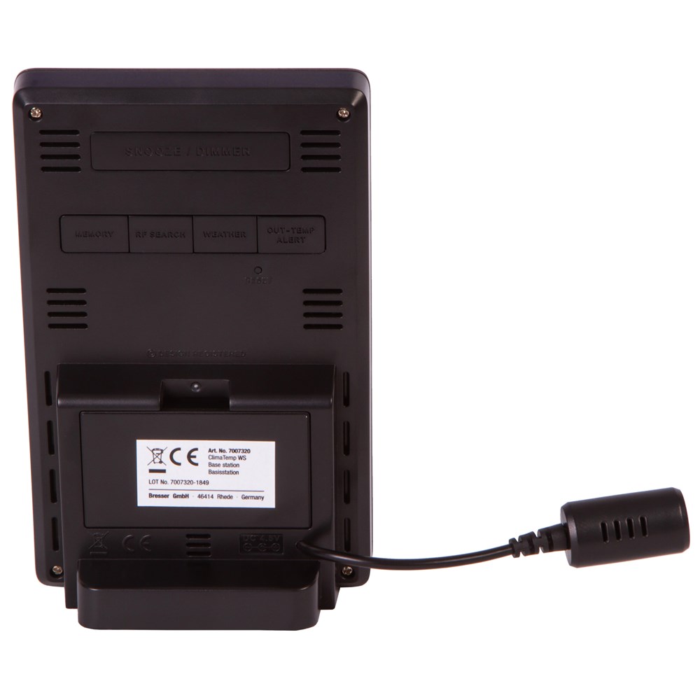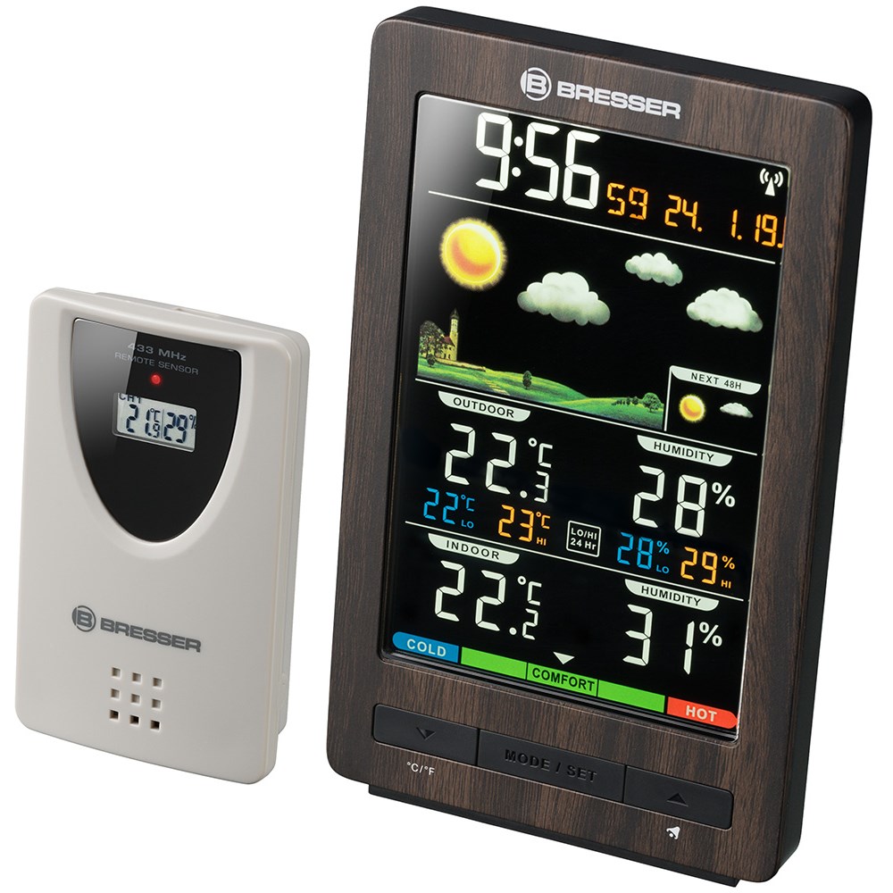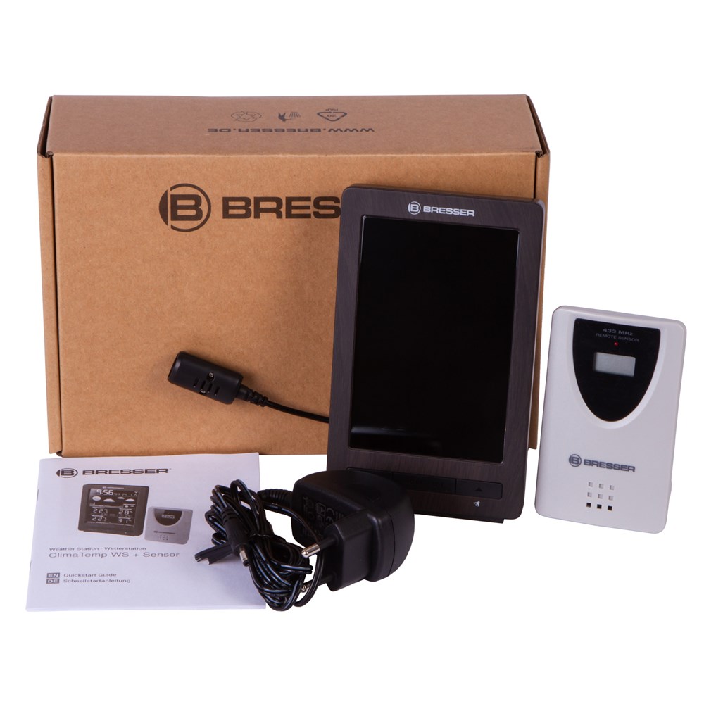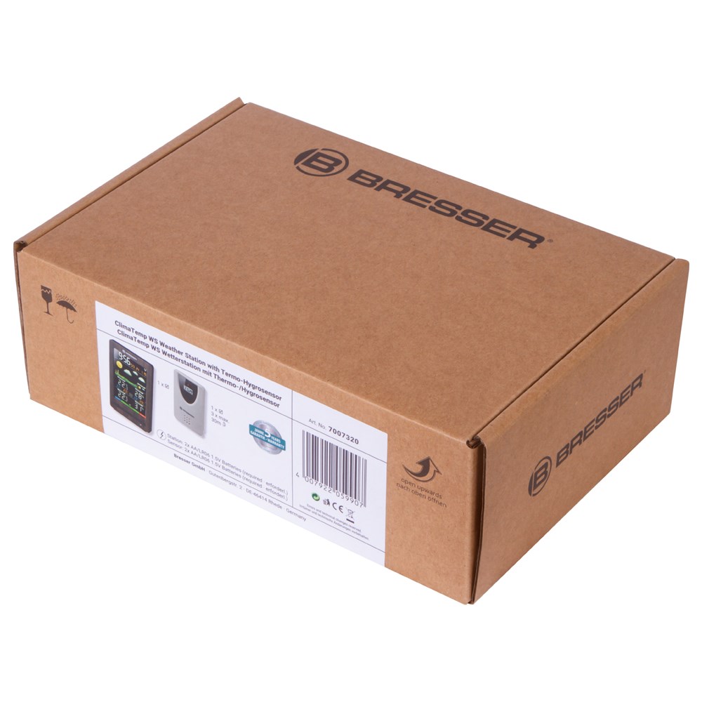 Bresser ClimaTemp WS – домашняя метеостанция, которая будет держать вас в курсе всех погодных изменений. Она не только показывает температуру и влажность воздуха, но и умеет составлять прогноз погоды на период до 48 часов. Кроме того, в приборе есть часы с будильником, а также индикатор общего уровня комфорта. В комплектацию включен наружный датчик. Вся информация отображается на цветном экране основного модуля. Вверху находятся время и дата, чуть ниже – изображение прогноза погоды, под ним – показания температуры и влажности воздуха внутри и снаружи помещения. За измерения в доме отвечает сама метеостанция, а уличные замеры производит наружный датчик. Его можно установить на расстоянии до 70 метров от метеостанции, данные передаются по радиоканалу. Метеостанция может работать от сети переменного тока (кабель в комплекте) или батареек (нет в комплекте). Датчик работает от батареек (нет в комплекте).