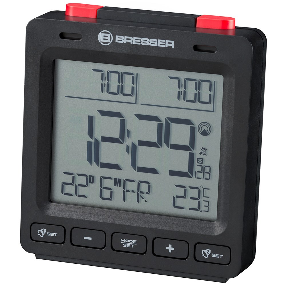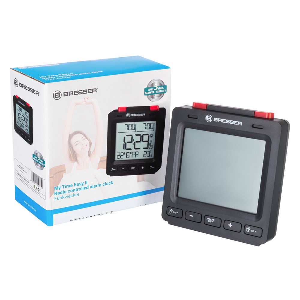 Цифровые часы Bresser MyTime Easy II не только показывают время, но также информируют о дате и дне недели, изменяют температуру в помещении и выполняют функцию будильника. При этом можно установить одновременно два независимых времени срабатывания. Также удобно, что будильник дополнен функцией повтора сигнала. На внешней панели расположены монохромный экран и кнопки управления. Кнопка будильника расположена сверху. Информация на экране подана четко и ясно, она разделена на блоки и хорошо читается даже с большого расстояния. В ночное время, чтобы увидеть время или температуру, можно включить подсветку. Для работы прибора требуются батарейки, которые не включены в комплект поставки.