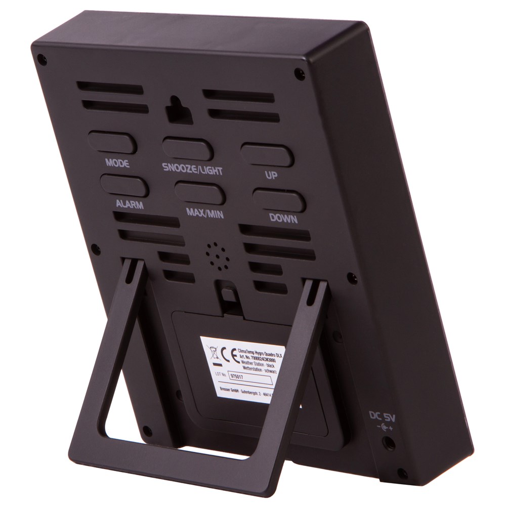 Bresser ClimaTemp Hygro Quadro – метеостанция с тремя беспроводными датчиками. Она позволяет проводить измерения температуры и влажности воздуха, показывает время и дату. Датчики можно разместить в разных комнатах квартиры или на улице, и таким образом получить максимально полную картину о микроклимате дома и погоде за окном. Датчики работают от батареек и передают информацию на метеостанцию по радиоканалу. Также у них есть встроенные экраны, на которых можно увидеть проводимые ими измерения. Экран метеостанции цветной и с крупной индикацией. Данные на нем представлены блоками, что упрощает понимание всей погодной ситуации. Основной модуль метеостанции работает от сети.