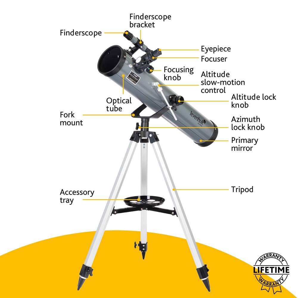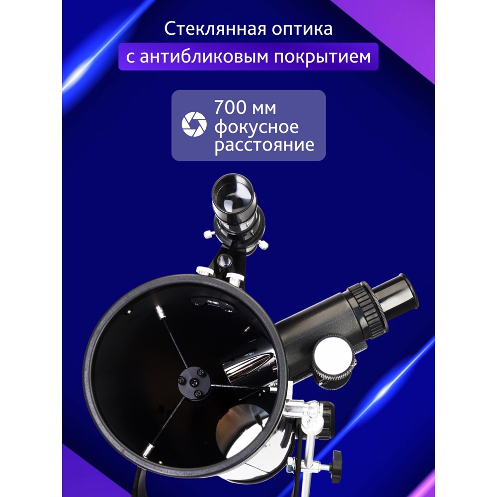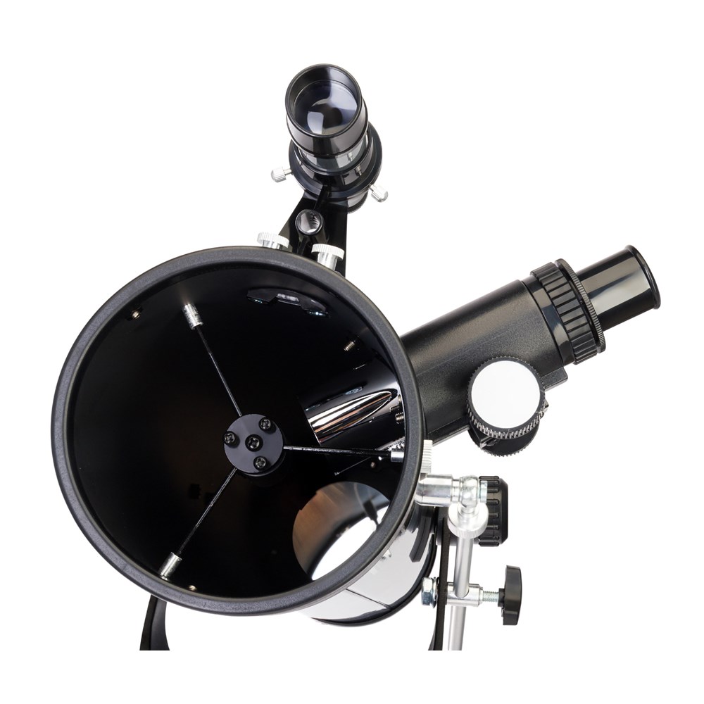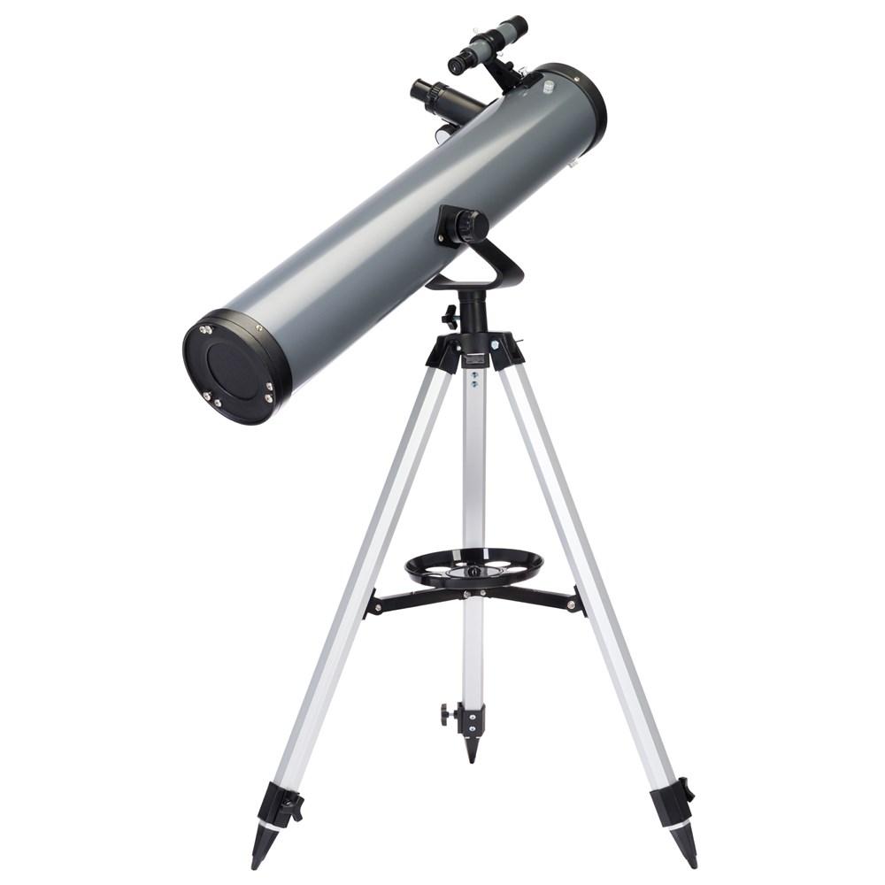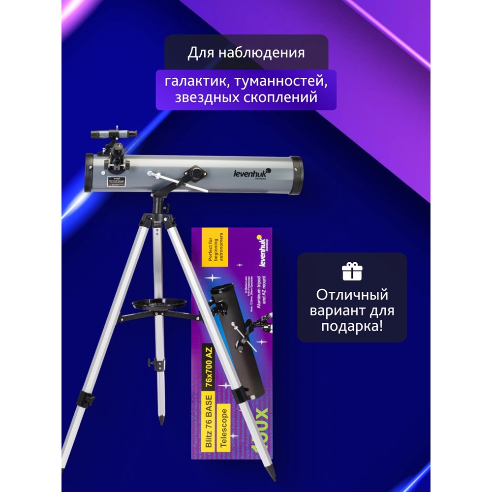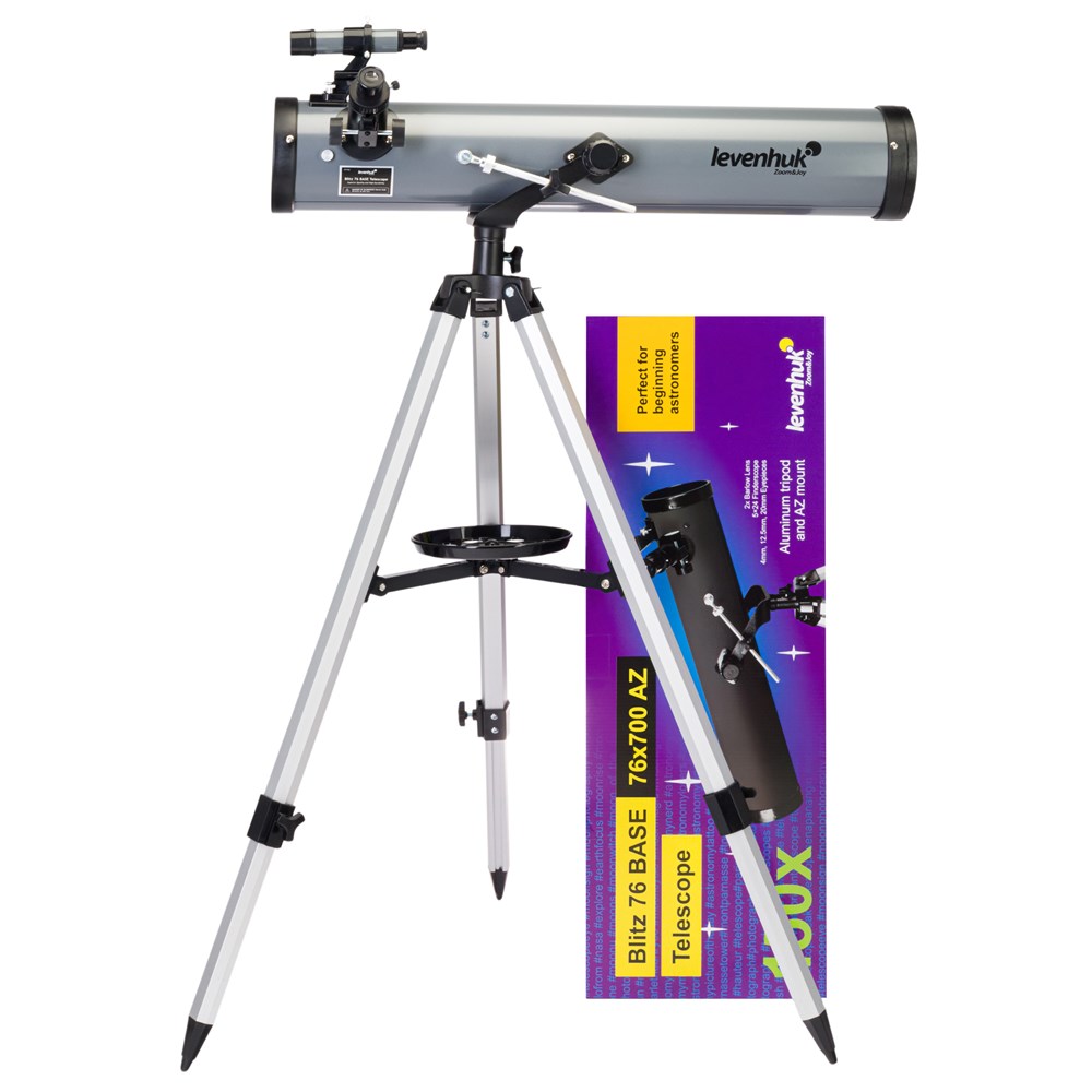 Рефлектор Ньютона Levenhuk Blitz 76 BASE создан для начинающих астрономов и позволяет проводить широкий спектр наблюдений. Лучше всего он подходит для изучения дальнего космоса, особенно шаровых и рассеянных скоплений. Также в него можно увидеть Луну и большинство планет Солнечной системы. Телескоп комплектуется всеми необходимыми аксессуарами и прекрасно подходит для подарка. В оптической схеме используются линзы и зеркала. Оптика сделана из стекла и дополнена антибликовым покрытием. Передаваемая телескопом картинка четкая и контрастная, свободная от искажений. Удобно, что в комплектацию включено три окуляра и линза Барлоу – благодаря им при наблюдениях можно использовать множество разных увеличений. Монтировка азимутальная, поэтому управлять телескопом очень просто – как обычной зрительной трубой. На вертикальной оси есть микровинт, с помощью которого можно производить более точную наводку на объекты. Тренога сделана из алюминия, дополнена полочкой для аксессуаров. При необходимости высоту треноги можно регулировать.