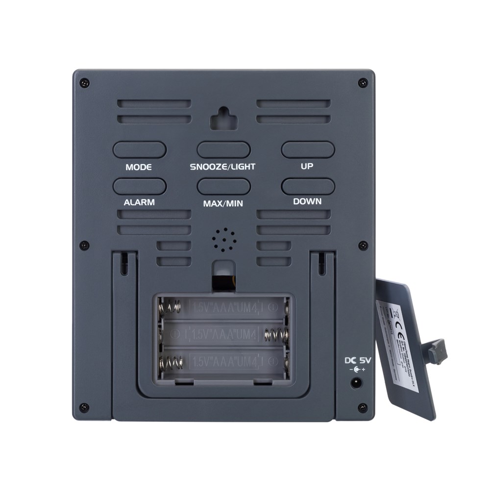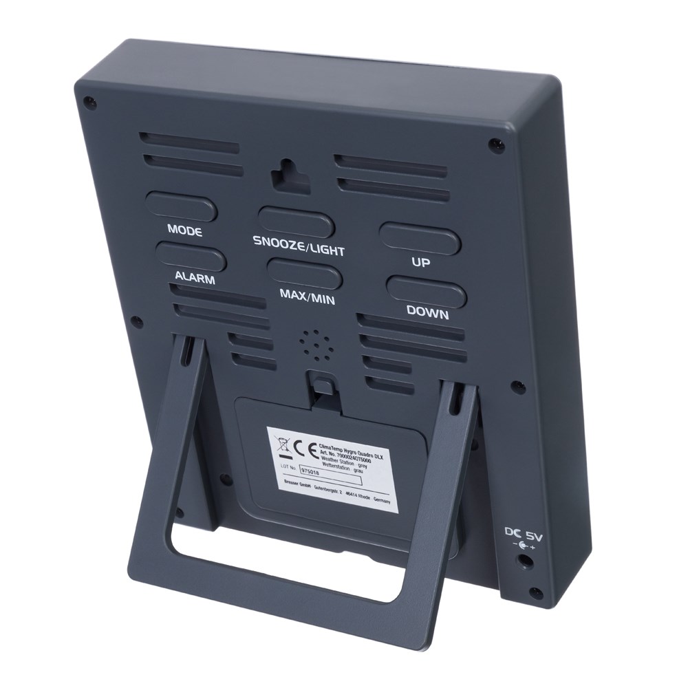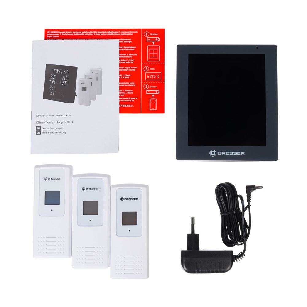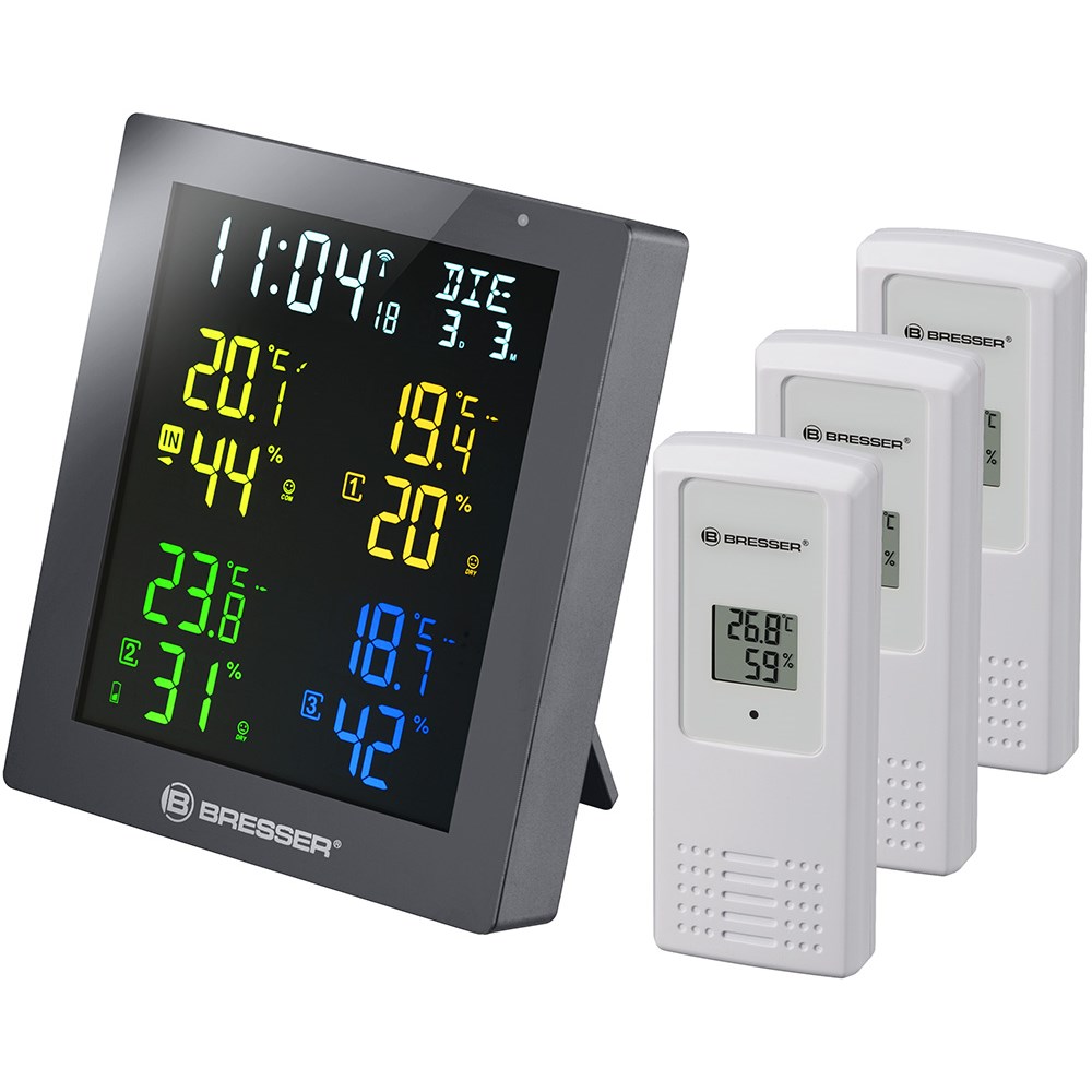 Гигрометр Bresser ClimaTemp Hygro Quadro – это возможность следить за изменениями микроклимата всего дома. Он комплектуется тремя датчиками, которые можно установить на расстоянии до 80 метров от основного модуля. Один можно поставить в спальню, второй – в кухню, третий – в детскую комнату, а сам гигрометр разместить, например, в гостиной. Информация о температуре и влажности воздуха будет передаваться на гигрометр по радиоканалу, все показания можно будет увидеть прямо на его экране. Экран гигрометра оформлен нестандартно. Большую часть занимают метеоизмерения, причем они различаются цветом – каждому датчику свой оттенок. Это позволяет быстро ориентироваться в информации. Также вверху экрана можно увидеть время и дату. Удобно, что каждый датчик тоже имеет встроенный экран, т. е. чтобы узнать актуальную температуру и влажность в помещении, необязательно идти к основному модулю. Прибор допускает настольное и настенное размещение и работает от батареек, для датчиков тоже требуются батарейки. Источники питания не включены в комплектацию.