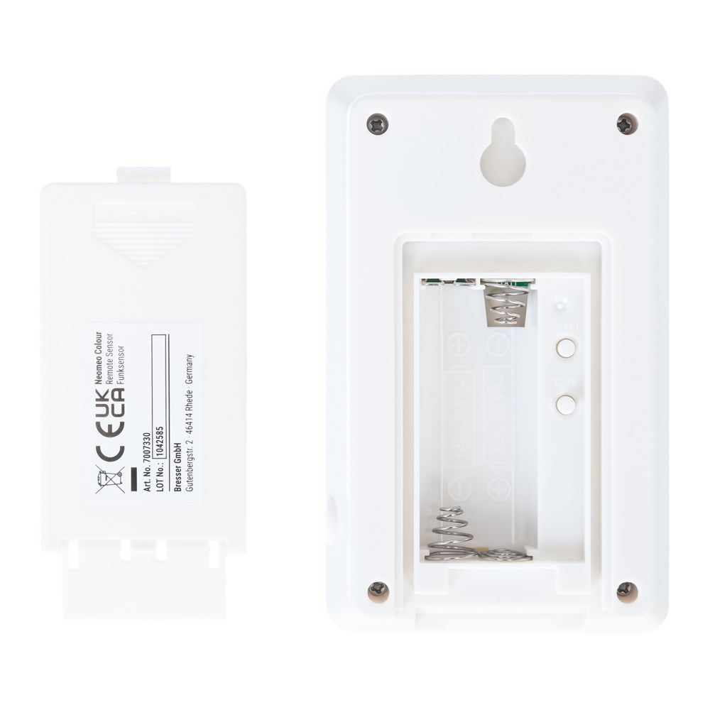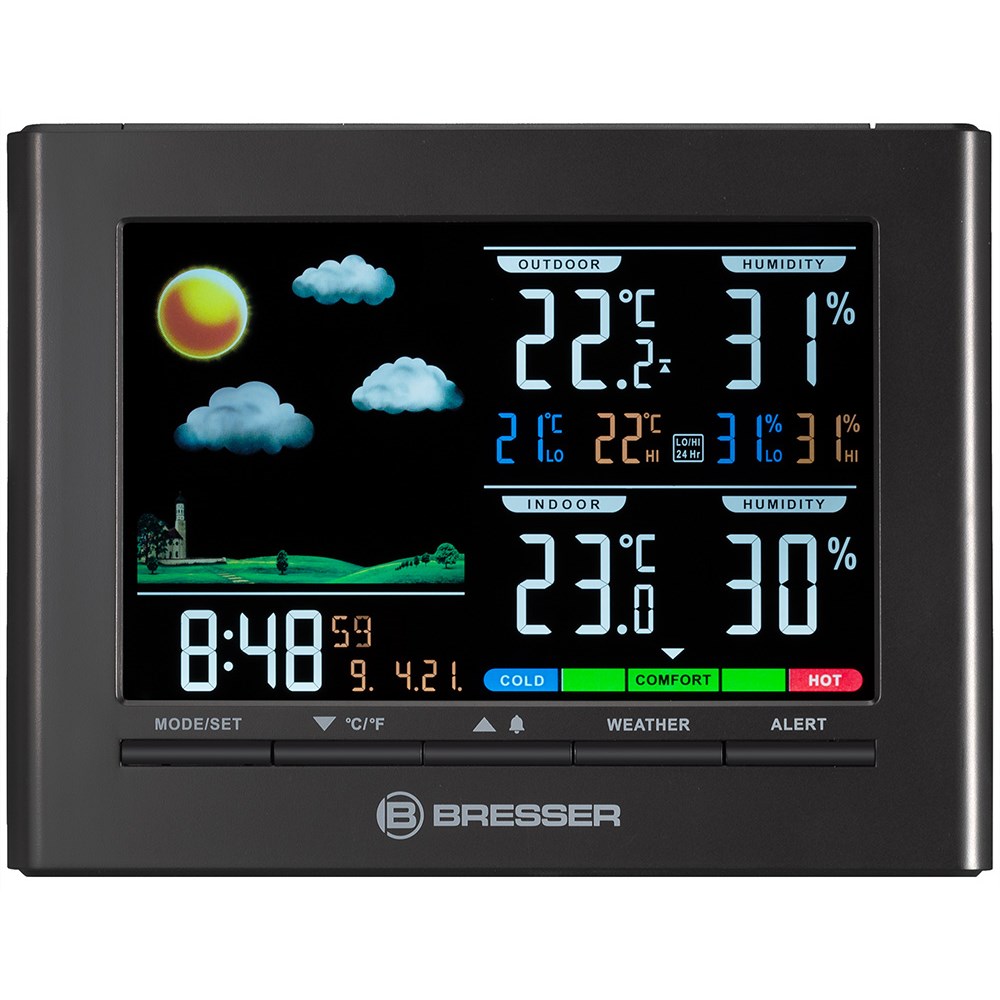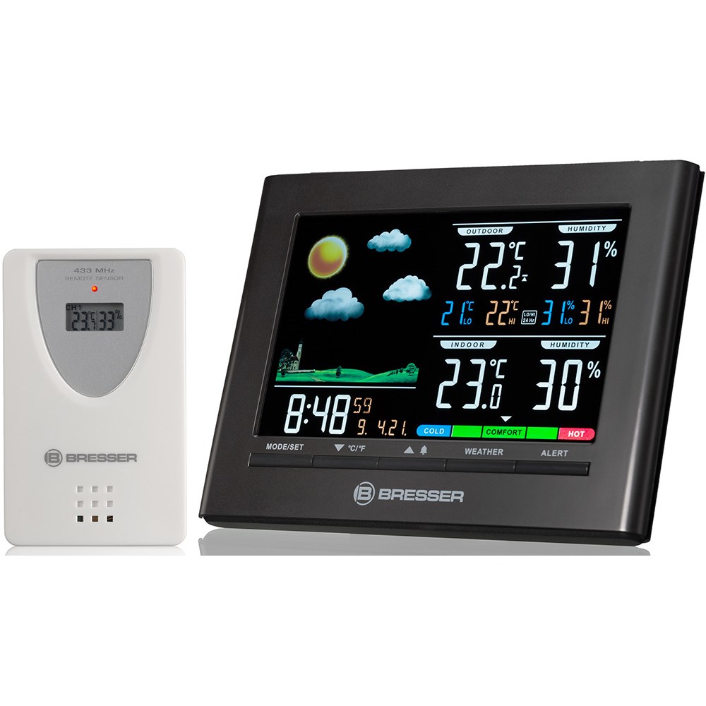 Метеостанция Bresser Neomeo с цветным дисплеем – это прекрасный подарок человеку, которому важна не только функциональность, но и внешний вид гаджета. Строгая и лаконичная, она прекрасно впишется в интерьер офиса, городской квартиры или загородного дома, оформленного в современном стиле. Метеостанцию можно устанавливать на откидную подставку или вешать на стену. Информация о погоде представлена на экране наиболее крупно: температура и влажность воздуха в помещении и на улице, а также минимумы и максимумы значений за последние 24 часа. Также большую часть экрана занимает изображение тренда погоды. Дополнительно на метеостанции можно видеть шкалу уровня общего комфорта, время и дату. Они показаны более мелко, но заметно. Прямо под экраном расположены кнопки управления прибором. Беспроводной датчик можно установить на расстоянии до 30 метров в прямой видимости от метеостанции. У него есть встроенный экран, для питания используются батарейки, что избавляет от необходимости прокладывать по квартире провода. Сама метеостанция может работать и от батареек, и от сети переменного тока.