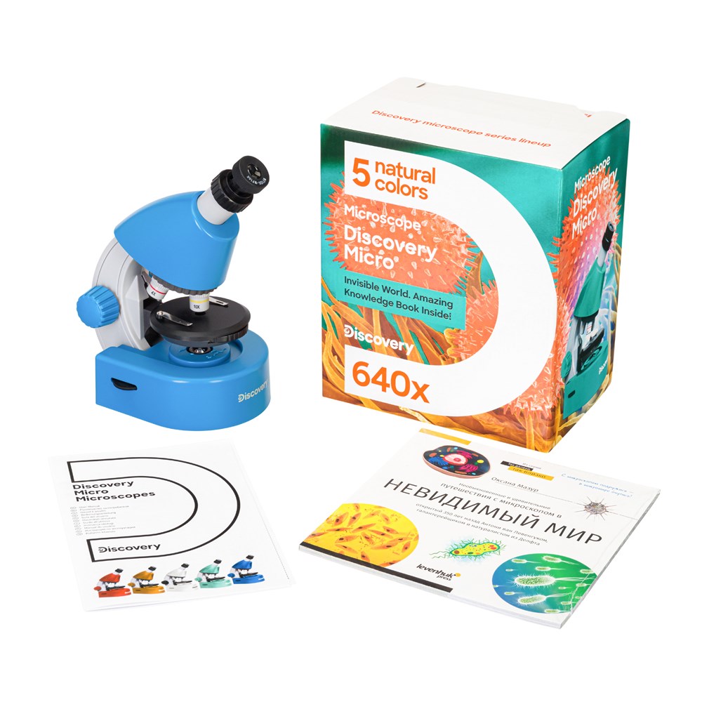 Discovery Channel (Дискавери ченэл) – всемирно известный научно-популярный телеканал о науке, технологиях, исследованиях и приключениях. Захватывающее сочетание историй разных жанров помогает взглянуть под разными углами на людей, места, организации и события, которые формируют наш мир. Discovery вдохновляет миллионы людей во всем мире, предлагая возможность открыть новое и утолить жажду познания. Мы с гордостью представляем серию оптики Discovery, произведенную Levenhuk при поддержке Discovery. Микроскоп Levenhuk Discovery Micro – приятный внешне и простой в использовании микроскоп, который стоит выбрать для первого знакомства с микробиологией. Он предназначен для изучения прозрачных образцов: тонких срезов тканей, жизни в капле воды, готовых микропрепаратов из наборов и проч. С его помощью начинающий пользователь сможет составить представление о том, как работает оптическая техника, и увидит множество красот микромира. Оптические возможности микроскопа Увеличение микроскопа находится в диапазоне от 40 до 640 крат. Это не так много, как у лабораторных моделей, но увидеть клетки и рассмотреть крошечных обитателей микромира с его помощью вполне можно. Резкость настраивается грубо при помощи ручек фокусировки, расположенных на корпусе. Монокулярная насадка имеет небольшой наклон в 45°, поэтому использовать микроскоп для длительных наблюдений очень удобно. Объективы с увеличениями 4х, 10х и 40х уже установлены в револьверное устройство, как и двухпозиционный окуляр – в окулярную трубку. Окуляр обеспечивает два увеличения: 10х и 16х. Он несъемный, поэтому риск случайной потери исключен. Нижняя подсветка регулируемой яркости Перед началом наблюдений образец помещается на предметный столик, где закрепляется при помощи металлических зажимов. Подсветка расположена внизу, интенсивность светового пучка регулируется при помощи диска с диафрагмами. Также есть настройка резкости. Светодиод работает от батареек, поэтому микроскоп можно использовать вдали от розетки. Благодаря такой мобильности прибор можно брать с собой в любые поездки, например за город. Книга знаний «Невидимый мир» в комплекте Книга «Невидимый мир» – это познавательное пособие, из которого можно узнать многое об устройстве микромира и том, как его лучше наблюдать. Текст простой и понятный, есть красочные иллюстрации, но основное – в книге описаны интересные научные опыты, которые можно провести дома самостоятельно. Важная особенность микроскопа – в комплекте вы найдете набор микропрепаратов Levenhuk Discovery «Флора и фауна», состоящий из 24 готовых образцов.