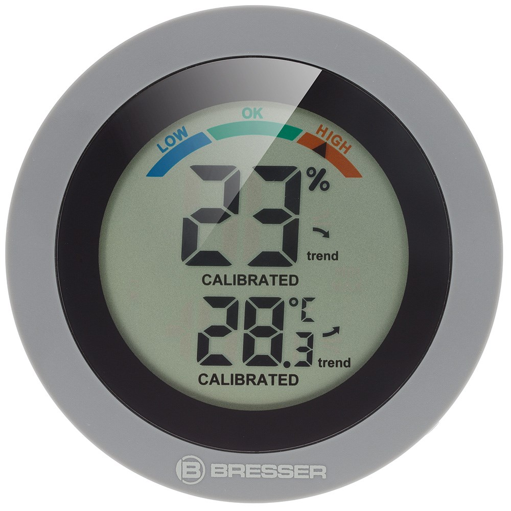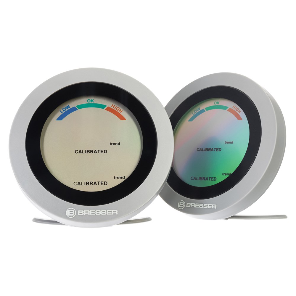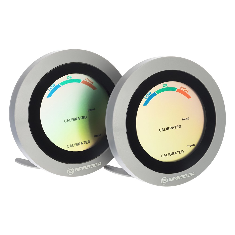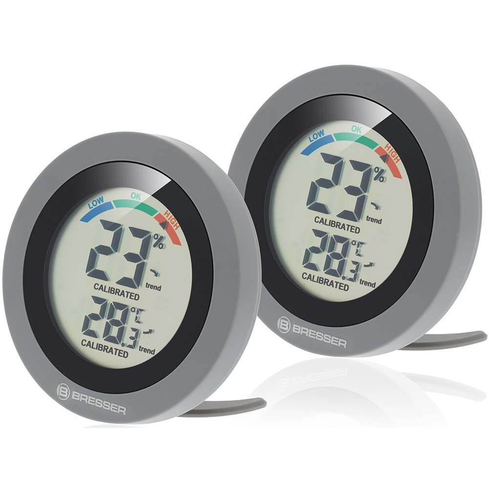 Перед вами набор из двух комнатных термогигрометров Bresser Circuiti Neo. Это компактные и очень простые в использовании приборы, которые позволяют следить за изменениями температуры и влажности воздуха в помещении. Также у них есть шкала уровня общего комфорта, которая сигнализирует о том, насколько благоприятны условия в доме. Метеостанции можно разместить в разных комнатах – так можно будет следить за микроклиматом сразу в двух местах. Приборы можно повесить на стену или поставить на специальную подставку. Для питания нужны батарейки, которые приобретаются отдельно.