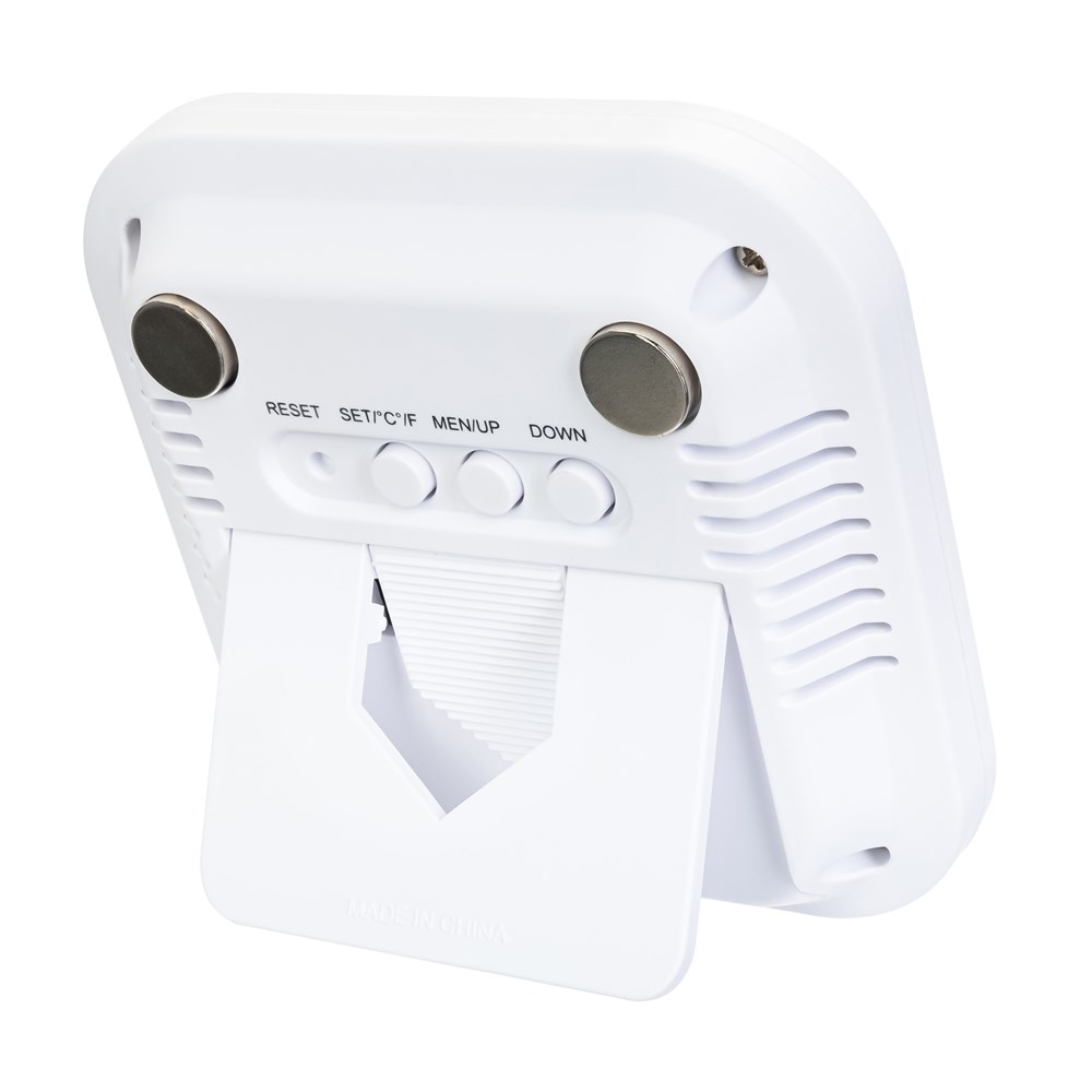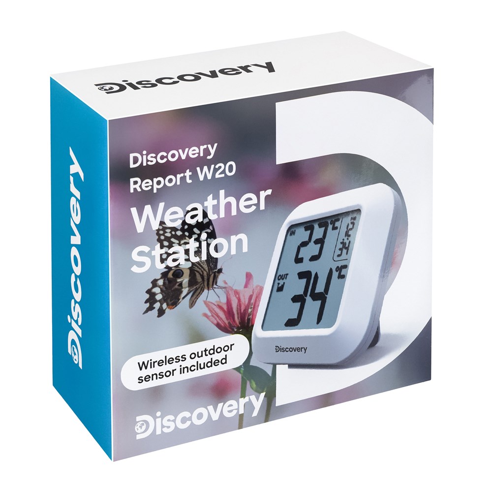 Discovery Channel (Дискавери ченэл) – всемирно известный научно-популярный телеканал о науке, технологиях, исследованиях и приключениях. Захватывающее сочетание историй разных жанров помогает взглянуть под разными углами на людей, места, организации и события, которые формируют наш мир. Discovery вдохновляет миллионы людей во всем мире, предлагая возможность открыть новое и утолить жажду познания. Мы с гордостью представляем серию оптики Discovery, произведенную Levenhuk при поддержке Discovery. Функционально Levenhuk Discovery Report W20 – это термометр и часы, причем именно температуре здесь отдано ведущее место. Основной модуль метеостанции проводит измерения внутри помещения, а датчик можно установить на улице или в соседней комнате – связь между приборами осуществляется по радиоканалу. Комплектный датчик не имеет встроенного экрана, поэтому информацию о температуре можно увидеть только на экране основного модуля. Экран монохромный, занимает большую часть передней панели прибора, имеет очень крупную и четкую индикацию. Датчик и метеостанция используют для питания батарейки.