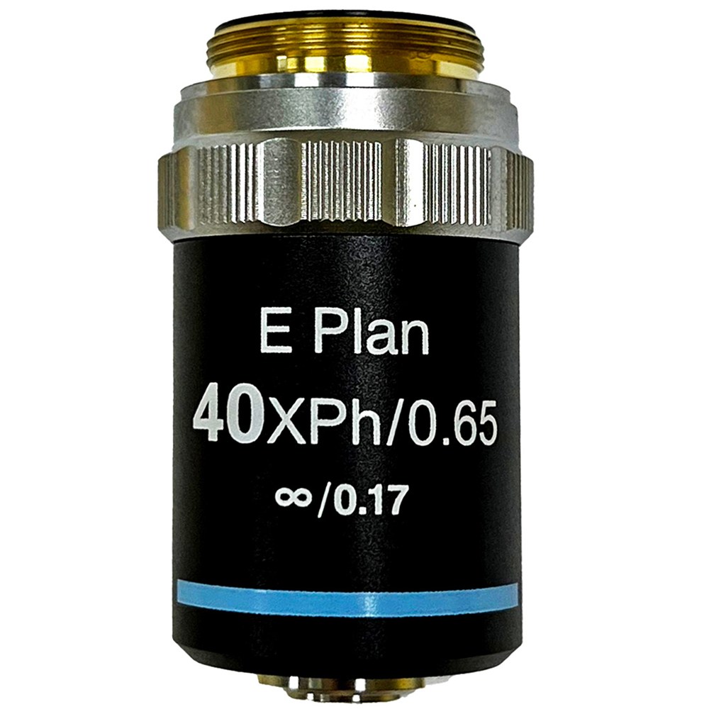 Объектив-планахромат Levenhuk применяется для фазово-контрастных исследований. Исправляет кривизну поля, формирует четкое и контрастное изображение, обладает 40-кратным увеличением. Апертура объектива равна 0,65, корректировка выполнена на длину тубуса «бесконечность». В исследованиях следует применять покровные стекла толщиной 0,17 мм.