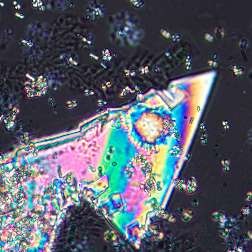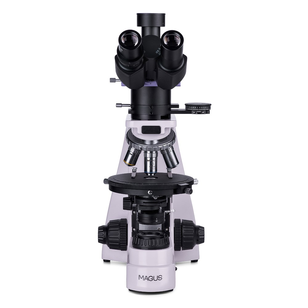 MAGUS Pol 800 – поляризационный микроскоп для исследования анизотропных объектов. Наблюдения проводятся в проходящем свете двумя методами: поляризации и светлого поля. Микроскоп оснащен объективами, свободными от напряжений, поэтому не вносит паразитных отражений в изображение. Передаваемая оптикой картинка четкая, контрастная, с хорошей прорисовкой мелких деталей. Микроскоп подходит для работы с биологическими, полимерными и геологическими объектами и может использоваться для исследовательской и диагностической работы в разных сферах науки, а также для обучения студентов вузов. **Оптическая схема** Микроскоп является тринокуляром, т. е. он имеет два окулярных тубуса для непосредственных наблюдений и отдельный канал визуализации, в который устанавливают цифровую камеру (нет в комплекте). Переключение светового потока – 100/0 или 0/100. Для удобства пользователя на левом тубусе размещено кольцо диоптрийной подвижки – с его помощью добиваются одинаково резкого изображения для обоих глаз пользователя. Кроме того, окулярные тубусы имеют удобный наклон для длительной работы – 30°. Револьвер рассчитан на установку пяти объективов. Так как в комплекте их четыре, то одно гнездо остается свободным – в него можно установить дополнительный объектив из линейки аксессуаров MAGUS. Объективы являются планахроматами, скорректированным на бесконечность и рассчитанными на покровное стекло толщиной 0,17 мм. Повернутый «от наблюдателя» револьвер позволяет видеть рабочий объектив, что удобно для пользователя. Гнезда револьверного устройства можно центрировать. **Система освещения** Источником проходящего света выступает 30-ваттная галогенная лампа. Освещение яркое, «теплое» по цветовой температуре, комфортное для глаз – оно создает оптимальные условия для результативной длительной работы. Возможна настройка освещения по методу Кёлера для получения изображения в максимальном разрешении по всему полю зрения. На микроскопе присутствуют анализатор и поляризатор. Для изменения угла поляризации их вращают относительно друг друга. В промежуточной насадке находятся слот для компенсаторов и линза Бертрана. При помощи компенсаторов усиливают контраст объектов, а линза Бертрана используется для коноскопии. **Механика** Образец помещают на центрируемый и вращаемый предметный столик. У столика есть отметки угла поворота и измерительная шкала, по которой можно определять угол с точностью до 0,1°. Рукоятки фокусировки позволяют проводить наводку на резкость грубо и тонко. В наличии регулятор жесткости и блокиратор хода грубой фокусировки. **Аксессуары** Для микроскопа доступны дополнительные аксессуары – с их помощью можно получить от оптики максимум и расширить функционал прибора. В линейку входят окуляры, объективы, калибровочные слайды, цифровые камеры. **