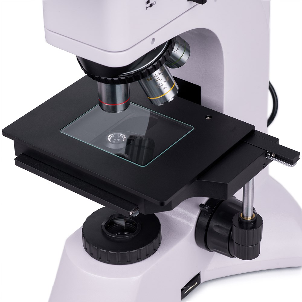 Микроскоп предназначен для исследования микроструктуры металлов, сплавов, полупроводниковых материалов, лакокрасочных покрытий и других непрозрачных объектов на плоскопараллельных полированных шлифах. Осветитель отраженного света предусматривает работу по методу светлого поля, темного поля и простой поляризации. Встроенный осветитель проходящего света служит для исследования полупрозрачных пленок и объектов на фильтрах: проб воздуха, воды, нефти и др. Микроскоп используется на предприятиях металлургической, машиностроительной, аэрокосмической, атомной и энергетической промышленности, в научно-исследовательских лабораториях и технических вузах. Цифровая камера Цифровая камера MAGUS CLM30 разработана для работы в свете люминесценции и по методу темного поля. Камера оснащена сенсором 8,3 Мпикс и формирует реалистичное изображение в разрешении 3840x2160 пикс. Камера рекомендуется для работы с объективами 4х, 10х, 20х и 40х. При работе с объективами малого увеличения камера позволит различить больше мелких деталей. Видеозапись ведется с частотой 45 или 70 кадров в секунду в зависимости от разрешения. Видео плавные, с мягкими и незаметными глазу переходами между кадрами. Передвижение препарата отображается в реальном времени, без задержек. Камера обеспечивает удобную работу с подвижными объектами, подходит для проведения демонстраций в аудитории. Камера оснащена интерфейсом USB 3.0. Скорость передачи данных в 10 раз выше, чем у камер с интерфейсом USB 2.0. Высокоскоростная камера рекомендуется для профессиональной работы в лаборатории, исследований или обучения в вузах. Визуальная насадка Тринокулярная визуальная насадка рассчитана на бесконечность. Цифровая камера устанавливается в вертикальный тубус с каналом визуализации. Переключатель светового потока позволяет направлять 100% света или на цифровую камеру, или на окулярные тубусы. Диоптрийная подвижка на левом окулярном тубусе. Револьверное устройство Револьвер на 5 объективов. Свободное отверстие служит для настройки положения лампы осветителя отраженного света. Также в свободное гнездо револьвера можно установить дополнительный объектив, который позволит получить еще одно увеличение. Револьвер повернут «от наблюдателя»: пространство над столиком свободно и пользователь видит объектив, который ввел в ход лучей. Объективы Объективы-планахроматы с увеличенным рабочим расстоянием предназначены для работы в светлом и темном поле. Фокусировка Коаксиальные рукоятки грубой и тонкой фокусировки расположены в нижней части корпуса с двух сторон штатива. Пользователь свободно кладет руки на стол и занимает расслабленную позу во время работы. Настройка фокуса происходит плавно и без усилий. С правой стороны находится рукоятка блокировки грубой фокусировки, с левой – кольцо регулировки жесткости хода грубой фокусировки. Предметный столик Перемещение объекта осуществляется за счет передвижения поверхности столика по двум осям. Максимальная высота наблюдаемого объекта составляет 20 мм. Стеклянная вставка в столик применяется для работы с полупрозрачными образцами. Источники света В осветителях отраженного и проходящего света стоят галогенные лампы. Галогенные лампы излучают свет, комфортной для глаз цветовой температуры. 30-ваттная лампа осветителя проходящего света с