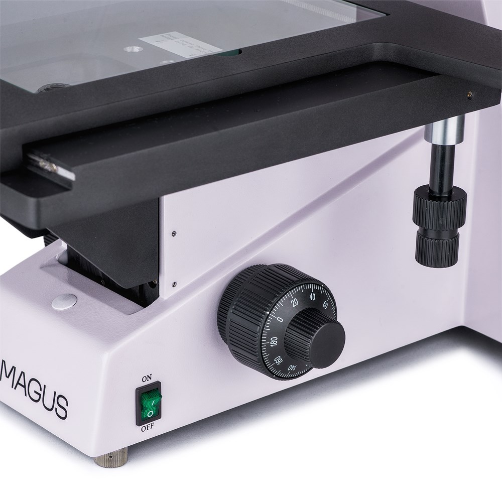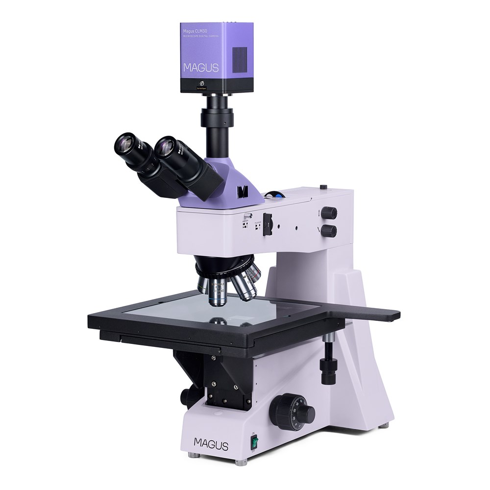 Микроскоп обеспечивает свободное размещение на предметном столике печатных плат, интегральных схем, фотошаблонов, изделий прецизионного формования и других крупных образцов для инспектирования их поверхности. Микроскоп предназначен для наблюдения микроструктуры металлов и сплавов, полупроводниковых материалов, контроля качества лакокрасочных покрытий и исследования других непрозрачных объектов. Осветитель отраженного света предусматривает работу по методу светлого поля, темного поля и простой поляризации. Микроскоп используется на предприятиях металлургической, машиностроительной, аэрокосмической, атомной и энергетической промышленности, в научно-исследовательских лабораториях и технических вузах. Цифровая камера Цифровая камера MAGUS CLM30 разработана для работы в свете люминесценции и по методу темного поля. Камера оснащена сенсором 8,3 Мпикс и формирует реалистичное изображение в разрешении 3840x2160 пикс. Камера рекомендуется для работы с объективами 4х, 10х, 20х и 40х. При работе с объективами малого увеличения камера позволит различить больше мелких деталей. Видеозапись ведется с частотой 45 или 70 кадров в секунду в зависимости от разрешения. Видео плавные, с мягкими и незаметными глазу переходами между кадрами. Передвижение препарата отображается в реальном времени, без задержек. Камера обеспечивает удобную работу с подвижными объектами, подходит для проведения демонстраций в аудитории. Камера оснащена интерфейсом USB 3.0. Скорость передачи данных в 10 раз выше, чем у камер с интерфейсом USB 2.0. Высокоскоростная камера рекомендуется для профессиональной работы в лаборатории, исследований или обучения в вузах. Визуальная насадка Тринокулярная визуальная насадка рассчитана на бесконечность. Цифровая камера устанавливается в вертикальный тубус с каналом визуализации. Переключатель светового потока позволяет направлять 100% света или на цифровую камеру, или на окулярные тубусы. Диоптрийная подвижка на левом окулярном тубусе. Револьверное устройство Револьвер на 5 объективов. Револьвер повернут «от наблюдателя»: пространство над столиком свободно и пользователь видит объектив, который ввел в ход лучей. Объективы Объективы-планахроматы с увеличенным рабочим расстоянием предназначены для работы в светлом и темном поле. Фокусировка Коаксиальные рукоятки грубой и тонкой фокусировки расположены в нижней части корпуса с двух сторон штатива. Пользователь свободно кладет руки на стол и занимает расслабленную позу во время работы. Настройка фокуса происходит плавно и без усилий. С правой стороны находится рукоятка блокировки грубой фокусировки, с левой – кольцо регулировки жесткости хода грубой фокусировки. Тонкая фокусировка производится с шагом 0,7 мкм. Упрощается наводка на резкость на большом увеличении. Предметный столик Перемещение объекта осуществляется за счет передвижения поверхности столика по двум осям. Инспекционный столик размером 280x270 мм с диапазоном перемещения 204 мм по обеим осям повышает удобство работы с протяженными и широкими объектами. Источник света В осветителе отраженного света стоит 50-ваттная галогенная лампа. Она светит достаточно ярко для работы на объективах увеличением от 4х до 100х не только в светлом поле и в поляризованном свете, но и в темном поле. Галогенная лампа излучает свет, ко