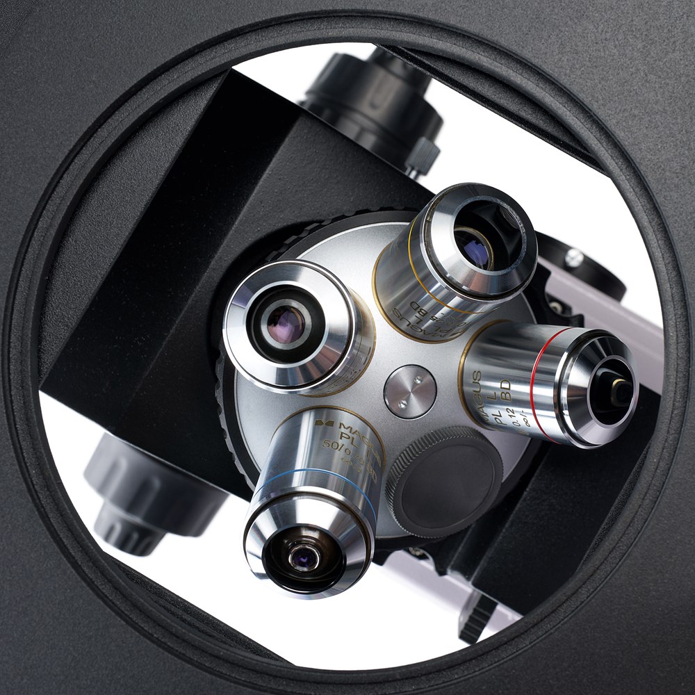 Микроскоп предназначается для изучения микроструктуры металлов и сплавов, полупроводниковых материалов и других непрозрачных объектов. Инвертированная конструкция микроскопа не ограничивает геометрию объекта исследования, а только ограничивает его массу – до 2 кг. Одна грань образца подвергается специальной обработке и образец устанавливается на столик вниз этой поверхностью. На этом микроскопе непрозрачные объекты исследуются в отраженном свете по методу светлого поля, темного поля и простой поляризации. Два независимых канала визуализации предусматривают одновременное подключение монитора и камеры. Микроскоп используется на предприятиях металлургической, машиностроительной, аэрокосмической, атомной и энергетической промышленности, в научно-исследовательских лабораториях и технических вузах. Цифровая камера MAGUS CHD40 – цифровая HDMI-камера с тремя видеоинтерфейсами и автоматическим переключением между 4K и Full HD в зависимости от разрешения монитора. Камера оснащена сенсором 8 Мпикс и формирует реалистичное изображение в разрешении 4К (3840x2160 пикс) при подключении через интерфейс HDMI или USB 3.0. При подключении через Wi-Fi разрешение изображения Full HD (1920x1080 пикс). Камера использует интерфейс HDMI для прямого подключения к телевизору, монитору или проектору. В этом режиме камера работает автономно, без компьютера. HDMI-подключение обеспечивает высокую и стабильную скорость передачи информации от камеры к внешнему экрану. Подключение к компьютеру осуществляется через сеть Wi-Fi и USB 3.0. Видеозапись ведется с частотой 30 кадров в секунду. Камера сочетает в себе большое значение FPS и высокую пропускную способность интерфейса HDMI, поэтому видео ощущаются «живыми», нет зависаний и разрывов между кадрами. На максимальном разрешении изображение информативно, движущиеся объекты видны без шлейфов, передвижение объекта отображается без задержек. Монитор Монитор MAGUS MCD40 предназначен для создания системы визуализации микроскопа MAGUS . Он подключается к установленной на микроскоп камере и выводит изображение в реальном времени. Поддерживаются HDMI-камеры MAGUS, работающие в разрешении 4К. Диагональ экрана – 13,3 дюйма. Матрица IPS обеспечивает яркую картинку с широкими углами обзора: если смотреть на монитор под углом, цветопередача не искажается. Монитор устанавливается на стол или полку на откидную подставку или крепится напрямую к камере или к штативу. Визуальная насадка Оптическая длина тубуса – бесконечность. Во время сборки микроскопа пользователь разворачивает тубусы насадки на 180° и выбирает высоту выноса зрачка в соответствии с собственным ростом. Визуальная насадка тринокулярная. Монитор устанавливается в вертикальный тубус визуальной насадки, а цифровая камера в боковой канал визуализации на корпусе микроскопа. Световой поток на тринокулярной насадке переключается 50/50 (канал визуализации открыт) или 100/0 (канал визуализации закрыт), на корпусе – 100/0 или 0/100. Револьверное устройство Револьвер на 5 объективов установлен на штатив под столиком. Свободное отверстие служит для настройки положения лампы осветителя отраженного света. Также в свободное гнездо револьвера можно установить дополнительный объектив, который позволит получить еще одно увеличение. Объективы Объективы-планахроматы на бесконечность с увеличенным рабочим р