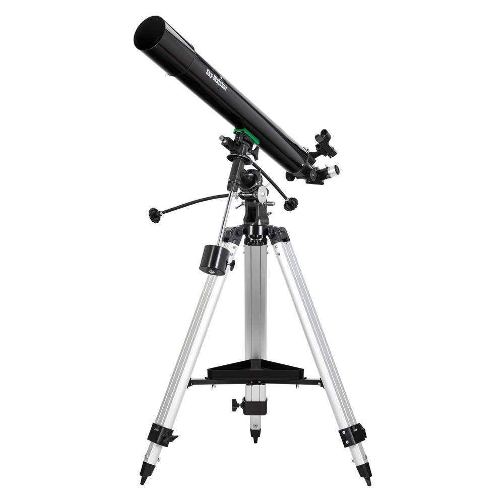 Sky-Watcher BK 809EQ2 Red dot – ахроматический рефрактор, установленный на экваториальную монтировку и алюминиевую треногу. Для начинающего астронома этот телескоп станет отличным подарком, так как он обладает отличными оптическими возможностями для наблюдения ближнего космоса и простым управлением. Оптика просветлена и эффективно убирает цветовые искажения из изображения. В базовой комплектации доступны два увеличения – 52х и 90х. Оба достигаются при помощи двух комплектных окуляров. При необходимости на телескоп можно установить дополнительные окуляры или линзу Барлоу для расширения его оптических возможностей. Посадочный диаметр – 1,25 дюйма. Для наземных наблюдений в комплекте есть диагональное зеркало. Управление монтировкой осуществляется вручную. Высота треноги регулируется, для размещения аксессуаров используется лоток – он устанавливается в центр треноги.