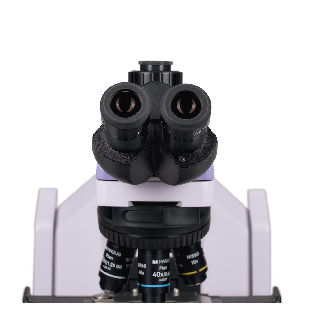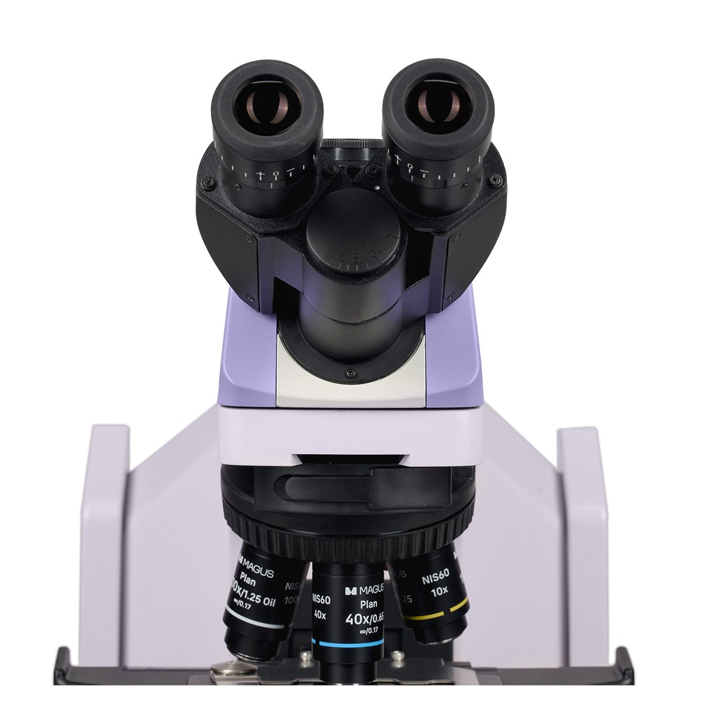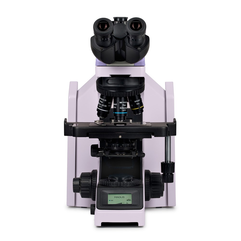 Микроскоп исследовательского класса. Предназначен для наблюдения прозрачных и полупрозрачных биологических образцов в виде мазков и срезов в проходящем свете в светлом поле. Установка опциональных компонентов позволит использовать методы темного поля, фазового контраста, люминесценции и поляризации. Кодированный револьвер сохраняет комфортную яркость при переключении объективов. Интеллектуальное управление освещением микроскопа повышают комфорт, скорость и эффективность работы исследователя. Благодаря «умным» функциям не нужно отвлекаться на настройки, внимание исследователя полностью сфокусировано на решаемых задачах. Визуальная насадка Тринокулярная визуальная насадка с оптикой, рассчитанной на бесконечность. Тубусы насадки вращаются на 360°. Пользователь выбирает высоту выноса зрачка в соответствии с собственным ростом. Цифровая камера устанавливается в вертикальный тубус с каналом визуализации. Деление светового потока 50/50. В базовую комплектацию включены окуляры 10х/22 мм с диоптрийной коррекцией и удаленным зрачком для работы в очках. Револьверное устройство и объективы Кодированный револьвер на 5 объективов, повернут «от наблюдателя»: пользователь видит объектив, который ввел в ход лучей, пространство над столиком свободно. В свободное гнездо револьвера можно установить дополнительный объектив, который позволит получить еще одно увеличение внутри диапазона кратности. Парфокальная высота объективов – 60 мм. Над револьвером находится слот с заглушкой для установки анализатора. Сохранение комфортной яркости при смене увеличений Объективы разного увеличения пропускают свет в разной степени, поэтому каждый раз при смене объектива требуется регулировка яркости света. Кроме того, яркость резко увеличивается при переключении с объектива большего увеличения на объектив меньшего увеличения. Резкое увеличение яркости вызывает утомление глаз. MAGUS Bio 270T оборудован интеллектуальным управлением яркости света. Оптимальный уровень яркости света включается автоматически на каждом объективе, что исключает неожиданные изменения яркости при смене увеличения. Эта функция оптимизирует рабочий процесс и снижает утомление глаз. Фокусировка При большом количестве объектов исследования оператор постоянно использует в работе рукоятку тонкой фокусировки. Для снижения нагрузки на запястье в микроскопе используется механизм с плавным и отзывчивым ходом. На рукоятке тонкой фокусировки есть специальные углубления под пальцы. Тонкая настройка фокуса происходит без усилий, кисть правой руки не устает. Рукоятки грубой и тонкой фокусировки коаксиальные, расположены низко. Исследователь кладет руки на стол и занимает комфортную позу для работы на микроскопе. Рукоятка блокировки грубой фокусировки помогает быстро настроить микроскоп после смены объекта исследования. Рукоятка расположена с левой стороны микроскопа на одной оси с механизмом фокусировки. Кольцо с правой стороны регулирует жесткость хода грубой фокусировки. Пользователь настраивает комфортную жесткость для работы. Предметный столик У столика отсутствует выдвижная зубчатая рейка по оси Х, что повышает эргономичность работы. Механизм с ременной передачей плавно перемещает объект. Препаратодержатель крепится двумя винтами и при ручном сканиро