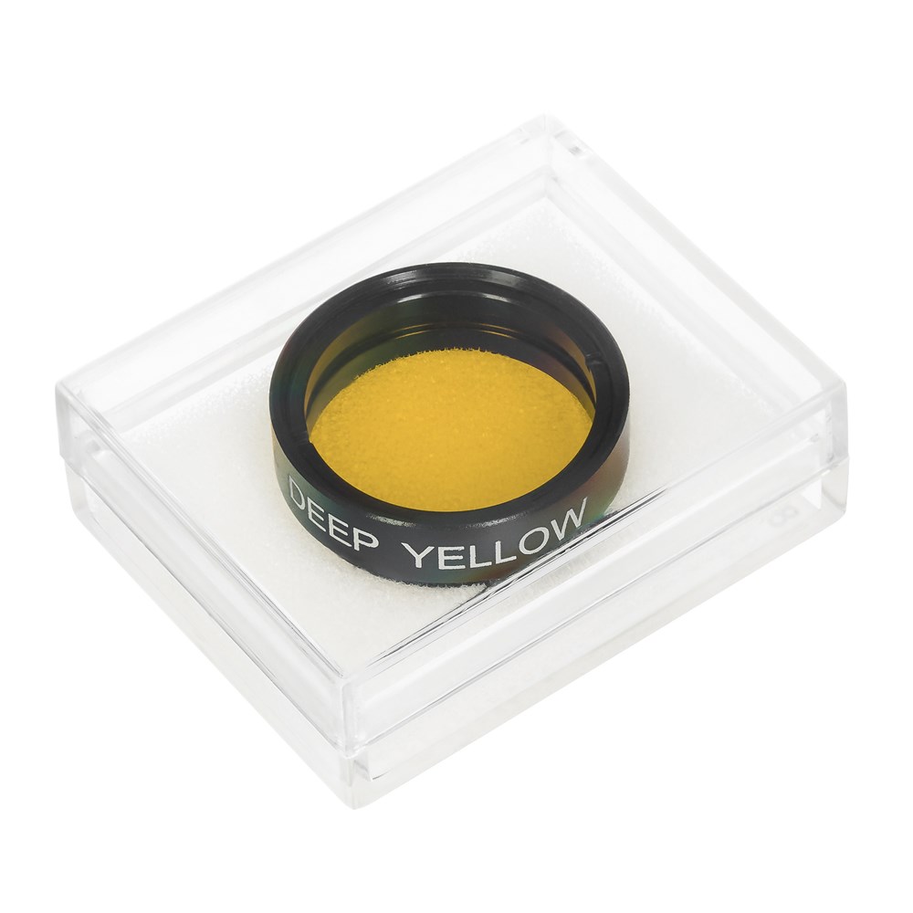 Светофильтр – это аксессуар для телескопа, позволяющий манипулировать характеристиками видимого изображения, улучшая контрастность и поднимая детализацию планетарных дисков, помогая в выявлении мелких особенностей поверхностей космических объектов, обнаружении обычно слабозаметных хвостов комет и т. д. Фильтр надевается на окуляр. Желтый светофильтр Sky-Watcher № 12 довольно универсален, его можно использовать для более подробного изучения всех планет C олнечной системы. Например, фильтр поможет улучшить видимость поверхности Сатурна и его колец, усилит контрастность поверхности Луны, позволит рассмотреть полярные шапки и пылевые бури на Марсе.