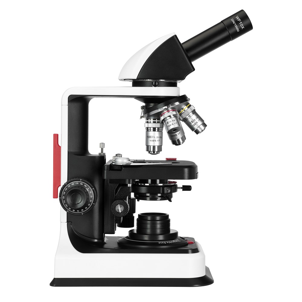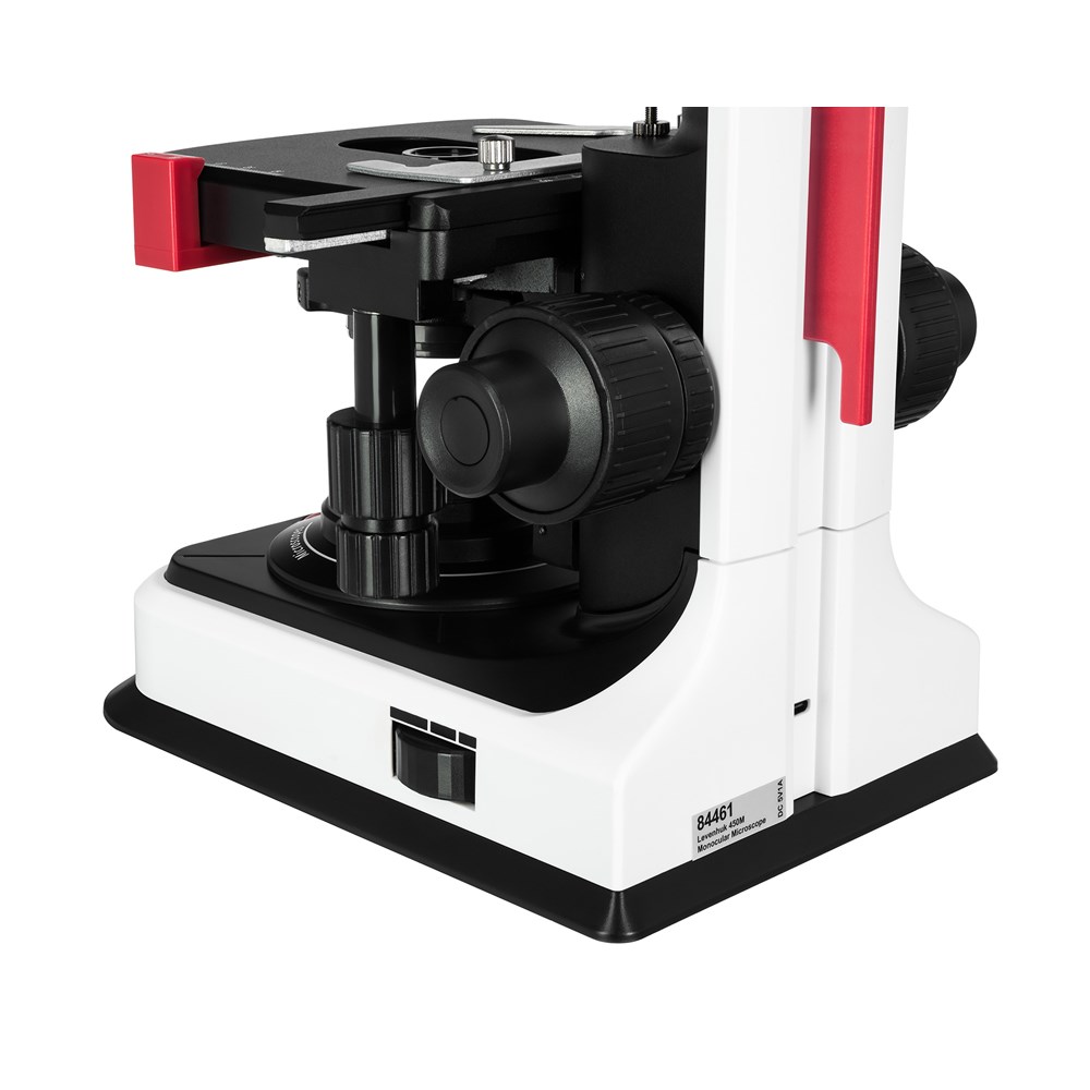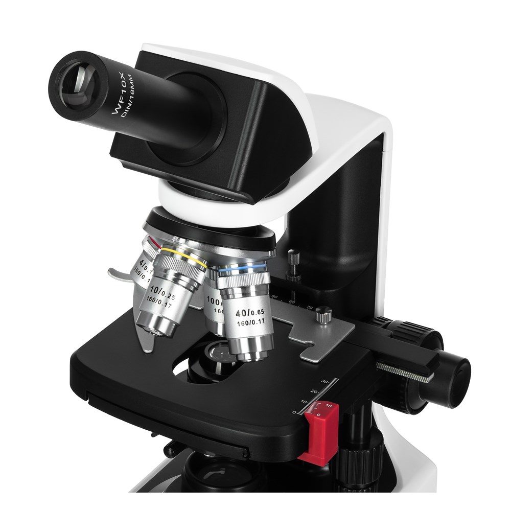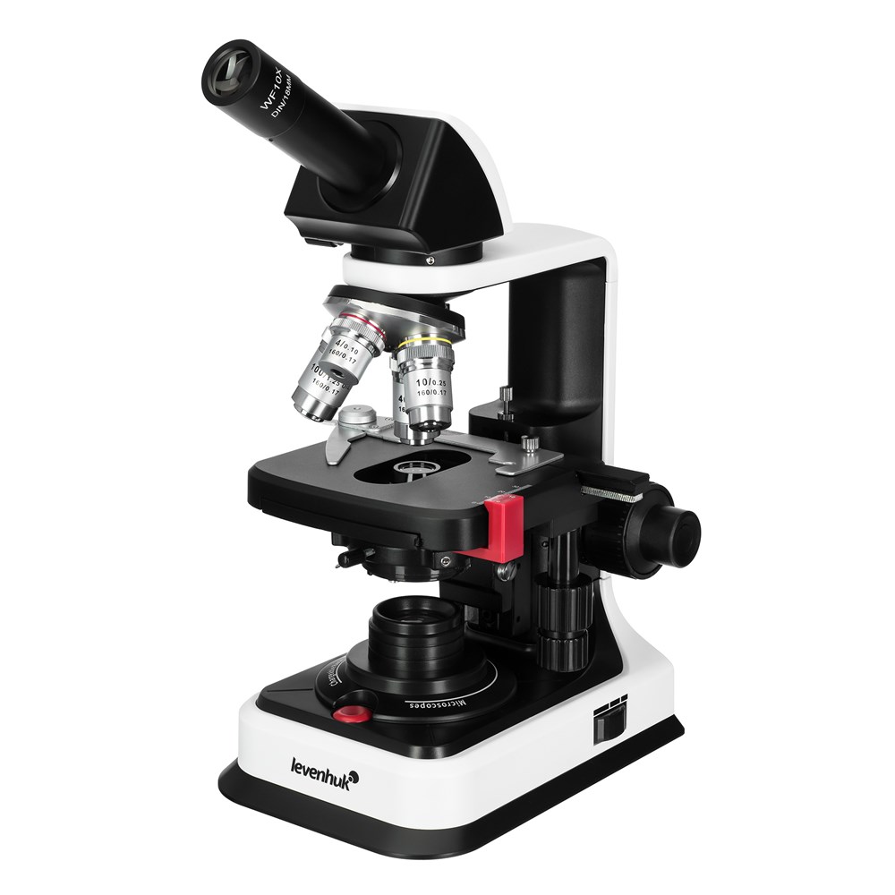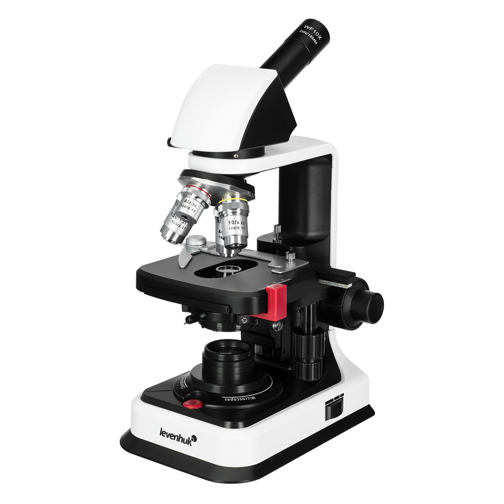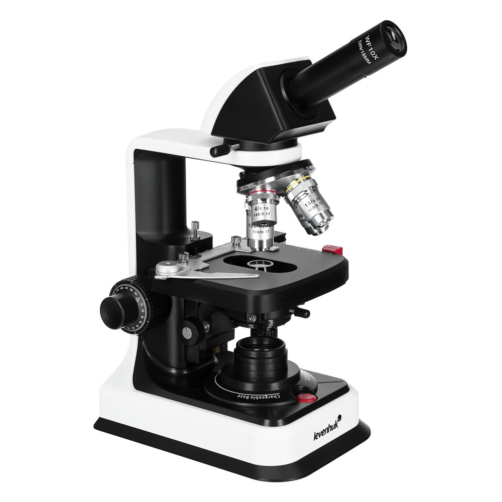 Биологический монокулярный микроскоп Levenhuk 450M – это мощный оптический инструмент, предназначенный для углубленного изучения микромира, биологических образцов и органических препаратов, который будет полезен профессионалам, студентам и заинтересованным любителям. Прибор используется для общеклинических медицинских диагностик, лабораторных исследований, в научно-исследовательской деятельности и в учебных целях. Микроскоп Levenhuk 450M имеет монокулярную насадку, установленную под углом 30° и свободно вращающуюся на 360°. Это обеспечивает комфортный обзор образца и удобство работы как в индивидуальном, так и в групповом формате. Используемый в конструкции широкопольный окуляр имеет увеличение 10х и поле зрения 18 мм. В приборе предусмотрена функция диоптрийной коррекции в пределах ±5 D, благодаря чему им могут свободно пользоваться люди с особенностями зрения и носящие очки. В микроскопе установлена ахроматическая оптика, обеспечивающая увеличение от 40 до 1000 крат и формирующая четкое, яркое и правдивое изображение. В револьверном устройстве размещено 4 объектива с увеличением 4х, 10х, 40х и 100х; последний можно использовать для наблюдений иммерсионным методом (флакон с маслом входит в комплект поставки). Для удобного позиционирования образца в конструкции микроскопа Levenhuk 450M предусмотрен предметный столик 110х120 мм. Под столиком расположен конденсор Аббе с ирисовой диафрагмой, регулирующей поток света, и специальными держателями для установки светофильтров. Фокусировка микроскопа осуществляется с помощью рукояток точной и грубой настройки коаксиальной системы. В качестве источника света в Levenhuk 450M используется светодиод 1 Вт с коллектором, обеспечивающий яркое и равномерное освещение препарата. Питается микроскоп как от сети 100-240 В через адаптер переменного тока, так и от 3 батареек типа АА – это делает прибор мобильным.