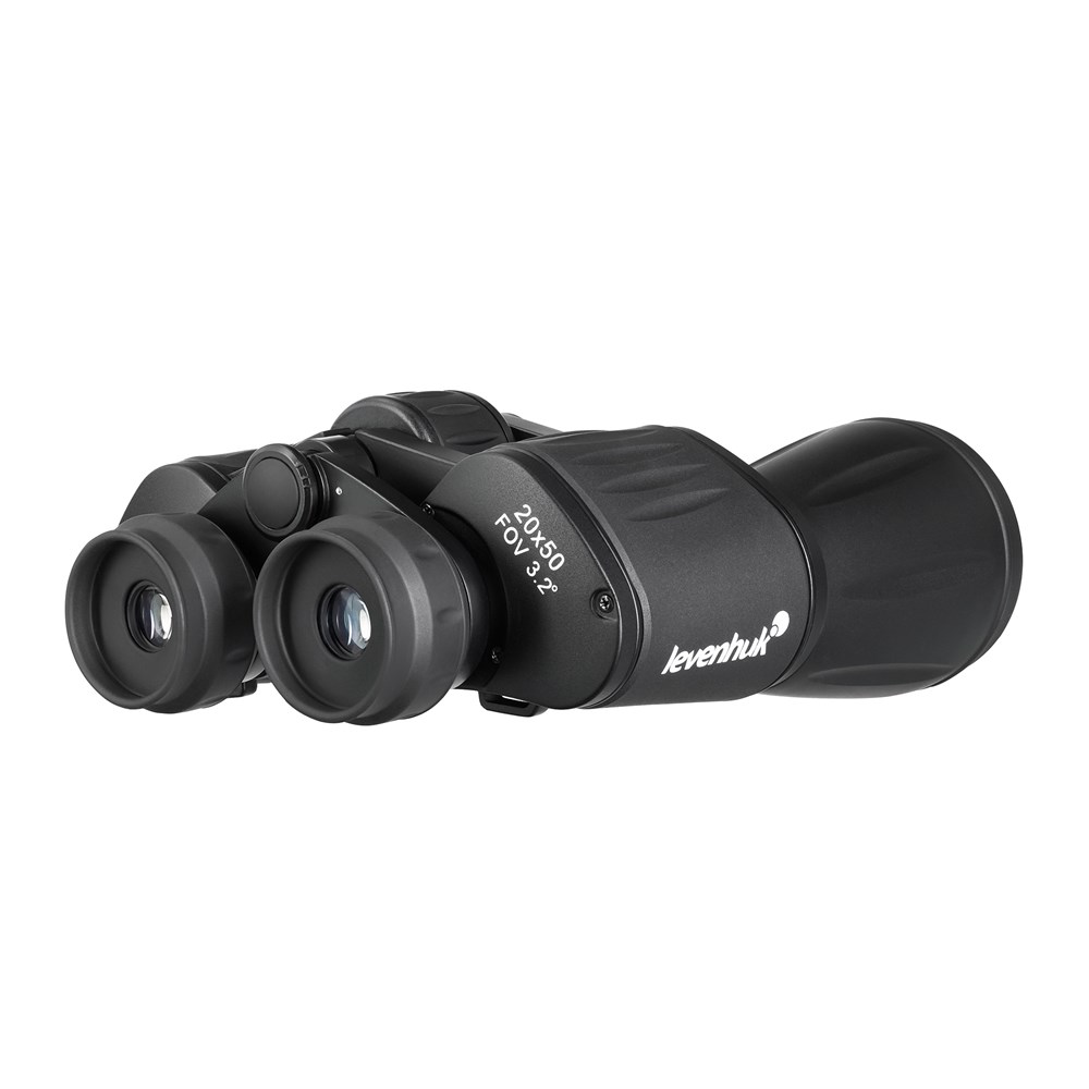 Бинокль Levenhuk New Atom 20x50 с призмами Порро отличается высокой кратностью 20x. Горная охота, наблюдение за звездами или дикой природой – далеко не полный список задач, в которых модель проявит себя наилучшим образом. Диаметр объективов равен 50 мм, оптика сделана из стекла BK-7 и полностью покрыта просветляющим слоем. Бинокль формирует яркую и контрастную картинку с хорошей прорисовкой деталей. Стоит иметь в виду, что высокая кратность заметно сказывается на ширине угла обзора и поля зрения. Так, на дистанции 1000 м поле зрения составляет 56 м. При этом фокусировка возможна от 11 м – большим барабаном с рельефной поверхностью, что в центре конструкции, который благодаря плавному ходу делает отслеживание объектов оперативным и удобным. Настройка межзрачкового расстояния в пределах 56–72 позволит каждому выбрать удобное положение окуляров. Также есть регулировка диоптрий (±3 D). Известно, что в биноклях с большой кратностью изображение может быть нестабильным – сказывается естественное дрожание рук, поэтому может оказаться полезной установка на штатив, для чего есть резьба под адаптер (в комплект не входит). Корпус бинокля из алюминиевого сплава прочен и довольно легок, его поверхность покрыта резиновым слоем, что придает прибору практичность. От непогоды предусмотрена защита уровня IPX3, которая справляется со снегом и дождем. В заключение стоит упомянуть комплектацию: помимо бинокля в нее включены такие аксессуары, как ремешок, защитные крышки оптики, салфетка из микрофибры и тканевый чехол.