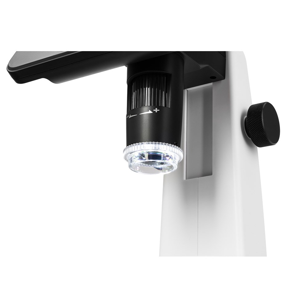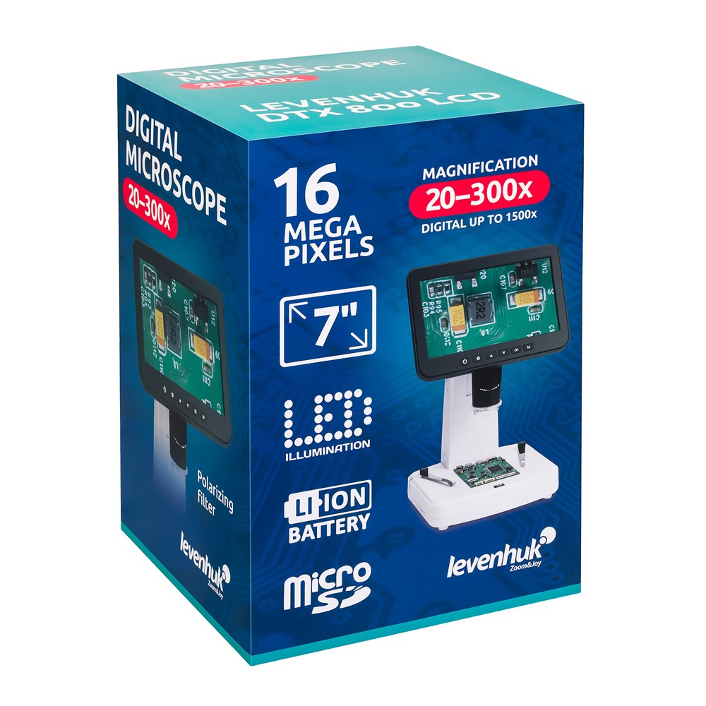 Цифровой микроскоп Levenhuk DTX 800 LCD подходит для использования новичками, любителями и профессионалами при изучении мелких органических и искусственных образцов, контроле качества материалов на производстве, решении медицинских, биологических и криминалистических задач, работе с мелкими деталями механизмов, минералами, монетами, ювелирными изделиями и т. д. Оптическое увеличение микроскопа находится в диапазоне от 20 до 300 крат, но его можно увеличить до 1500 крат, используя цифровой зум. Изображение выводится на яркий цветной IPS -экран с диагональю 7" и разрешением 1024x600 пикс – это позволяет пользователю вести длительную работу с микроскопом без быстрого развития усталости спины и шеи и перенапряжения зрения. В качестве объектива в Levenhuk DTX 800 LCD выступает цифровая камера 4 Мпикс. Помимо формирования картинки наблюдаемых препаратов она также может быть использована для съемки фото и видео. Разрешение фотографий можно настраивать – доступны варианты 2 Мпикс, 3 Мпикс и достигнутые методом интерполяции 5/8/10/12/16 Мпикс. Для видео доступно только одно разрешение – 1440р с частотой смены кадров 30 FPS . Отснятые медиаматериалы записываются на съемную карту памяти microSD (приобретается отдельно), поддерживаемый объем – до 128 ГБ. Микроскоп работает по методу светлого поля. Подсветка – светодиодная, с возможностью регулировки уровня яркости. Есть поляризационный фильтр, который будет полезен при изучении сильно отражающих образцов, – он устраняет блики от граней драгоценных камней и поверхностей ювелирных изделий. Эффект поляризации достигается поворотом кольца фильтра. Предметные стекла устанавливаются на неподвижный предметный столик с двумя прочными препаратодержателями. Возможности Levenhuk DTX 800 LCD можно расширить при помощи идущего в комплекте ПО – программы PortableCapture Plus, позволяющей производить измерения рассматриваемых образцов (линейные, угловые размеры) и оставлять пометки на кадрах. Микроскоп поддерживает два типа подключения к внешним устройствам: USB (для совместной работы с компьютером) и HDMI (для вывода изображения на внешний монитор или телевизор). При полном заряде аккумулятора микроскоп способен работать 2 часа без перерыва. Время, которое потребуется для полной зарядки аккумулятора – 4,5 часа. Будьте осторожны при использовании прибора в холодной среде: его диапазон рабочих температур составляет 0…+40 °С – важно не опускаться ниже минимального значения, чтобы не навредить устройству.