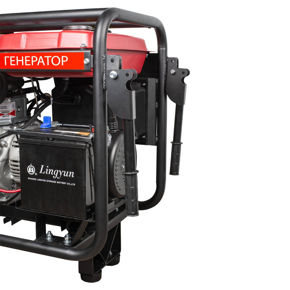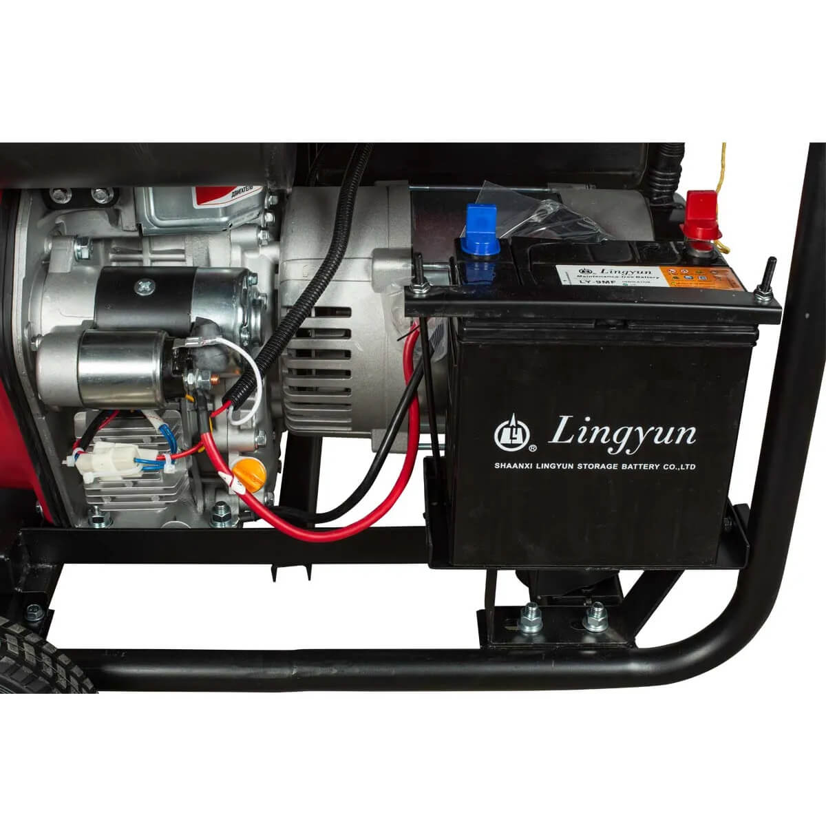 Установка оборудована электростартером, что позволяет быстро и удобно запускать ее поворотом ключа. Такое решение особенно актуально на выезде и для решения задач, требующих частых перестановок. Электростартер питается от аккумулятора, который подзаряжается в процессе работы. Возможность ручного запуска сохранена, она может пригодиться в непредвиденных ситуациях.