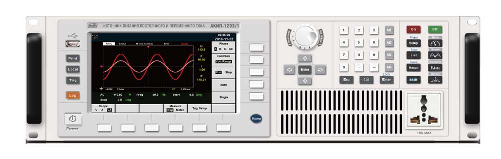 | Особенности | Источник питания постоянного и переменного тока (1ф). Широкий диапазон установки выходных параметров (напряжение, частота, фазовый угол). Дискретная установка выходных параметров с шагом от 0,01 В. Низкий коэффициент гармоник (0,5%). Одновременная индикация - напряжение, частота, ток, полная и активная мощность, коэффициент мощности. Выход на передней и задней панели. Функция диммера (регулировка скважности). ПО для моделирования импульсов, провалов напряжения и других нарушений в сети электропитания. |
