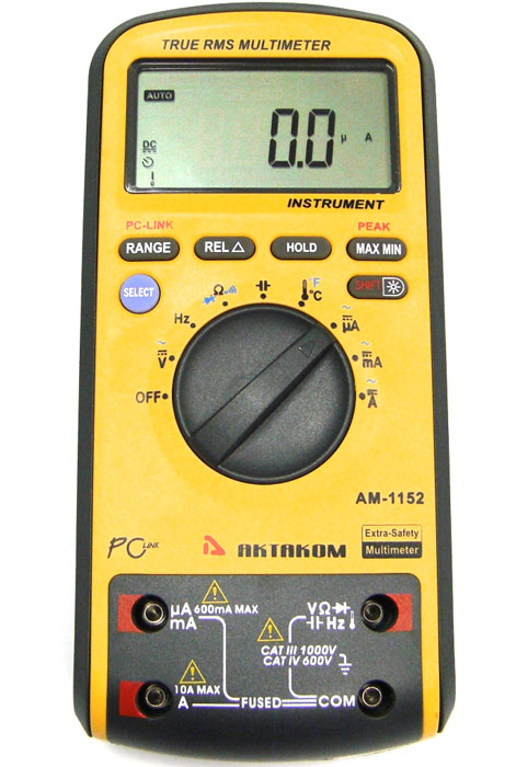 Мультиметр Актаком AM-1152 повышенной безопасности предназначен для измерений постоянного и переменного тока и напряжения, сопротивления, емкости, частоты, температуры, коэффициента заполнения, проверки диодов и прозвонки электрических цепей.