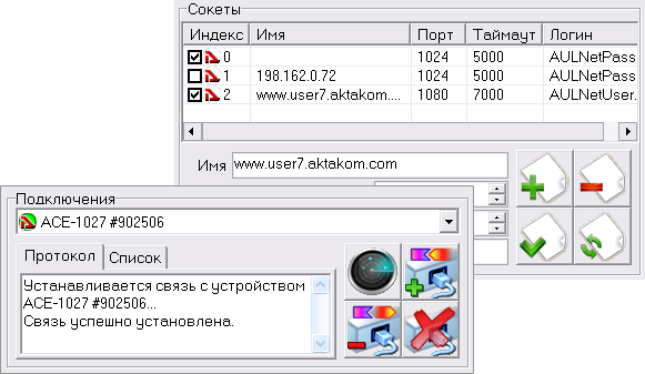 Подключение прибора к программе выглядит стандартным для многоканальных приложений AKTAKOM образом: кнопки поиска приборов, подключения и отключения устройства, список обнаруженных доступных приборов. В списке отображаются как локально подключённые (USB-кабелем к компьютеру, на котором работает приложение), так и обнаруженные в сети устройства (поиск проводится по указанным в списке сокетов адресам).