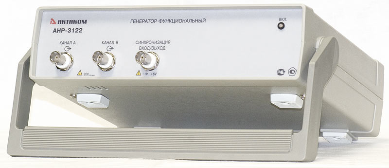 Двухканальный виртуальный цифровой генератор сигналов произвольной формы представляет собой 12-разрядный цифровой прибор в стандартном конструктиве приборов серии «USB-лаборатория АКТАКОМ», и выдает сигнал произвольной формы или сигнал одной из стандартных форм (синусоидальная, прямоугольная, треугольная и некоторые другие) по двум каналам одновременно. Задание формы и параметров сигналов производится пользователем с помощью компьютера независимо для каждого из каналов. Прибор имеет общий для обоих каналов вход внешней синхронизации для запуска генерации по внешнему событию. Генератор сигналов также вырабатывает выходной сигнал для синхронизации запуска других приборов.