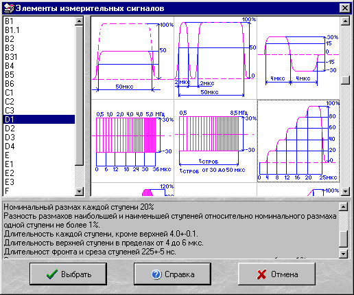 Панель библиотека стандартных элементов измерительного сигнала предназначена для выбора стандартных элементов, добавляемых в измерительный сигнал. В верхней части окна расположены список стандартных элементов измерительного сигнала, предусмотренных ГОСТ 18471-83, и графическое изображение каждого сигнала с его основными параметрами. Ниже в окне размещено описание выделенного элемента по ГОСТ 18471-83.