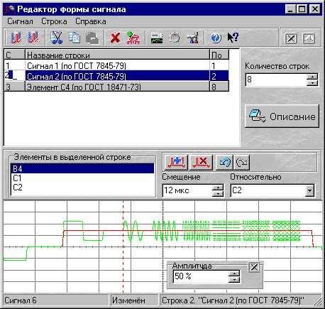В верхней части панели редактора формы сигнала расположено окно редактора сигнала. Сигнал редактируется построчно. Список строк сигнала отображается в таблице. Группы одинаковых строк изображаются в таблице одной «выпуклой» строкой, выделенной серым цветом. Пользователь может редактировать название строки (или группы одинаковых строк), а также номера начальной и конечной строк группы. При изменении номера конечной строки группы происходит копирование содержимого выделенной строки в следующие строки, или содержимого последующих строк в выделенные. Аналогично при изменении номера начальной строки группы происходит копирование содержимого выделенной строки в предыдущие, или содержимого предыдущих строк в выделенные.