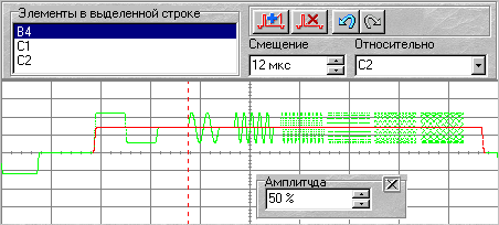 В редакторе строки находятся список стандартных элементов измерительного сигнала, содержащихся в редактируемой строке, индикатор смещения выделенного элемента и список элементов привязки. Ниже на графике изображены осциллограммы редактируемой строки и выделенного элемента. Точка отсчета для измерения смещения (элемент привязки) обозначена пунктирной линией. По умолчанию смещения отсчитываются от начала строки (переднего фронта строчного синхронизирующего импульса), но по желанию пользователя за начало отсчета может быть выбран любой элемент строки.