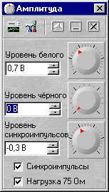 В программе хранится математическое описание каждого стандартного элемента измерительного сигнала. В качестве параметров в него входят амплитуды синхронизирующего импульса, уровни чёрного и белого. Уровень строчных гасящих импульсов всегда равен 0 В. Пользователю предоставляется возможность задавать значения этих параметров в вольтах, используя регуляторы на панели регулировки амплитуды. Кроме того, можно исключить из сигнала строчные синхронизирующие и гасящие импульсы.