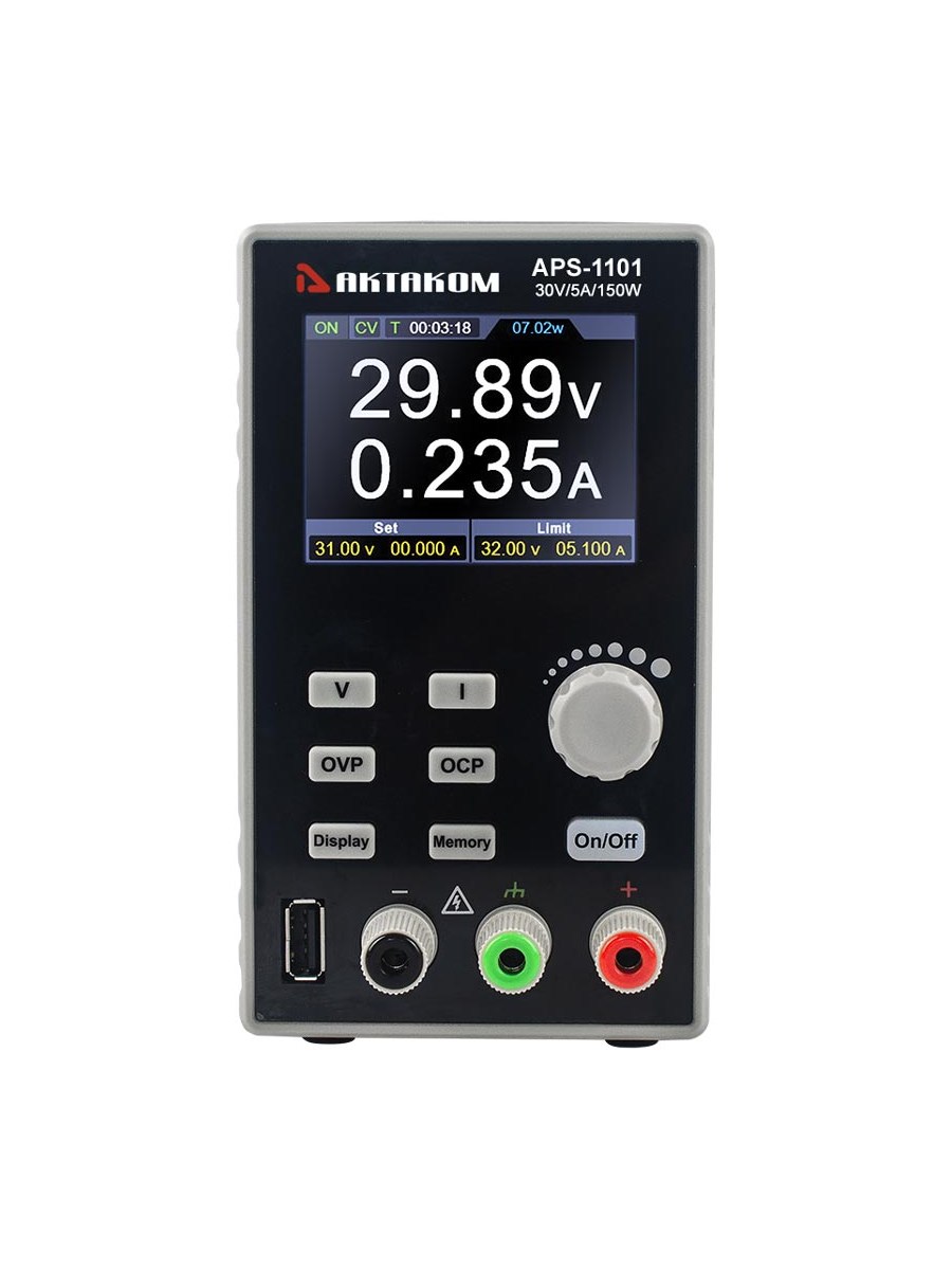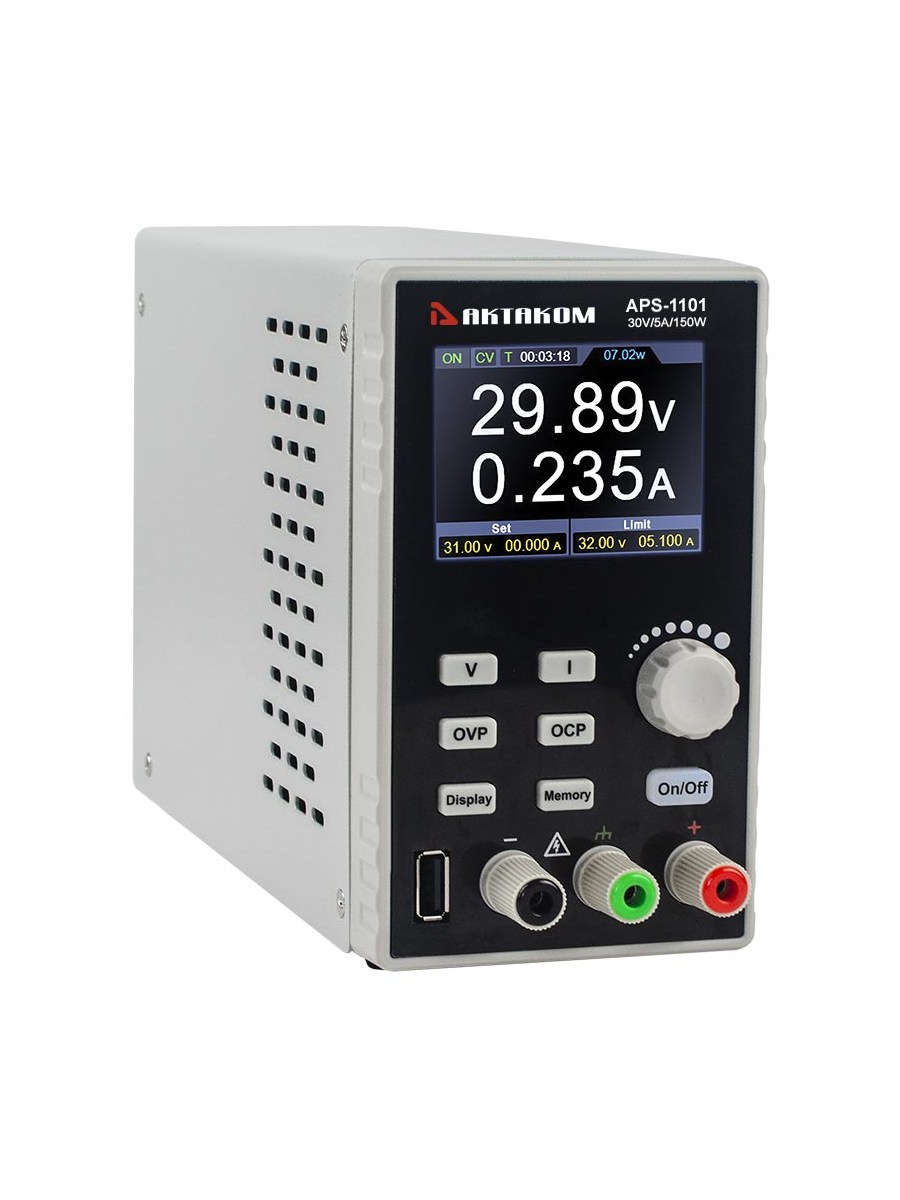 1 Канал. Импульсный. Программируемый. Выходное напряжение / ток: 0…30 В / 0...5 А. Максимальная мощность 150 Вт. Выход USB 5 В/1 А. Разрешение (установка/считывание) 10 мВ/1 мА. Пульсации/шум 30 мВскз /30 мАскз. Кнопка включения/отключения нагрузки. Функция мониторинга. Работа по списку 10 групп. Сохранение 4 групп. Защита OVP, OCP с заданием. 2,8 " ЖК индикатор. Интерфейс USB. SCPI команды. Размеры 82 x 142 x 226 мм.