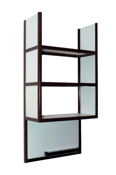 Полка навесная для организации рабочего места над столом. Габаритные размеры(ВхГхШ): 1000х300х750. Три уровня полок (ш х г) 690 х 300 мм, регулируемые по уровню. Внизу полки перфорированный лист (ш х г) 690 х 500мм для навески крючков для инструмента, а также три клеммы заземления. Оснащена блоком розеток АТР-9108.Цвет ДСП-белый, цвет алюминиевого каркаса - коричневый.
