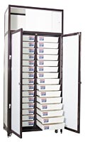 Стойка комплектовочная 90 х 50 х 202 см. Цвет алюминиевого каркаса - коричневый (RAL-8017), цвет ДСП - белый. 30 ящиков 33 x 40 x 8 см в два ряда. 2 дверцы из полупрозрачного стекла с замком. Полка 84 x 44 см с раздвижными дверцами из оргстекла. 4 колеса, 4 винтовые ножки.