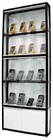 Стойка демонстрационная, узкая. Цвет алюминиевого каркаса - коричневый (RAL-8017), цвет ДСП - белый. 4 застекленные полки с раздвижными, запираемыми дверками. Внизу одна техническая полка со сдвижными дверками. 2 светодиодных светильника по 10 Вт. Крепление к стене. Габариты 780х180х2020 мм.